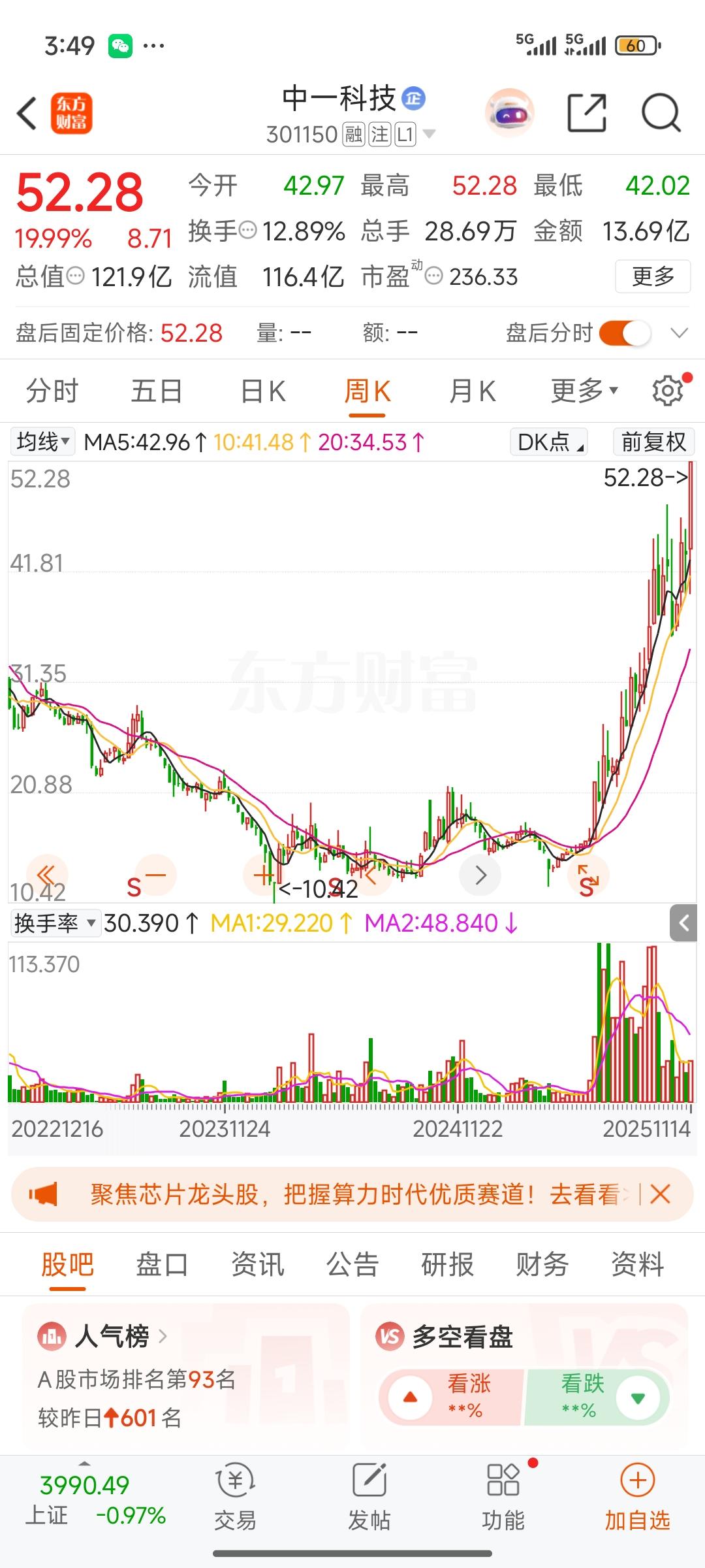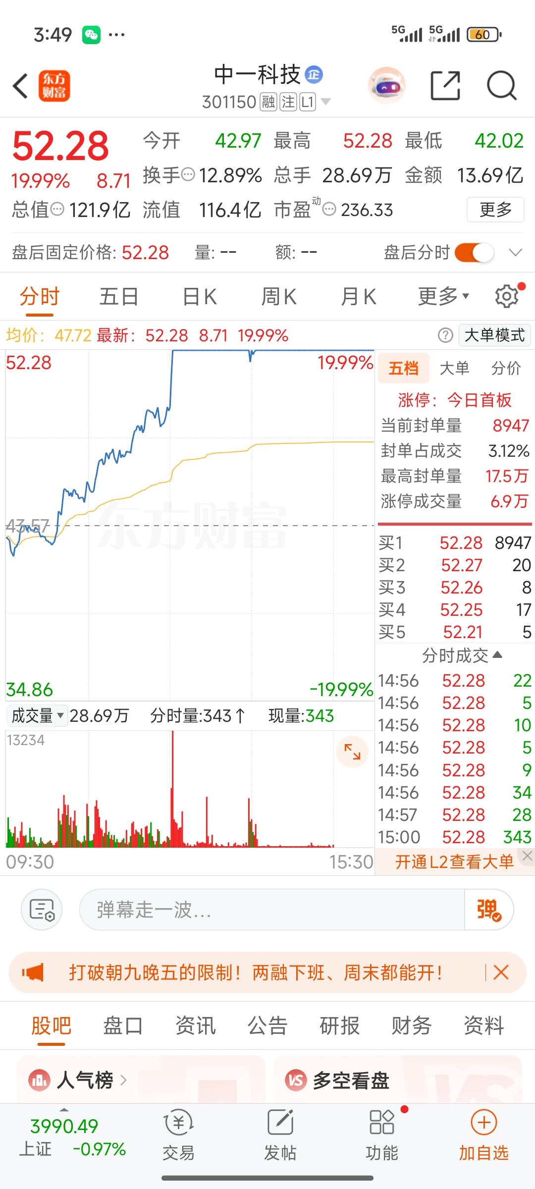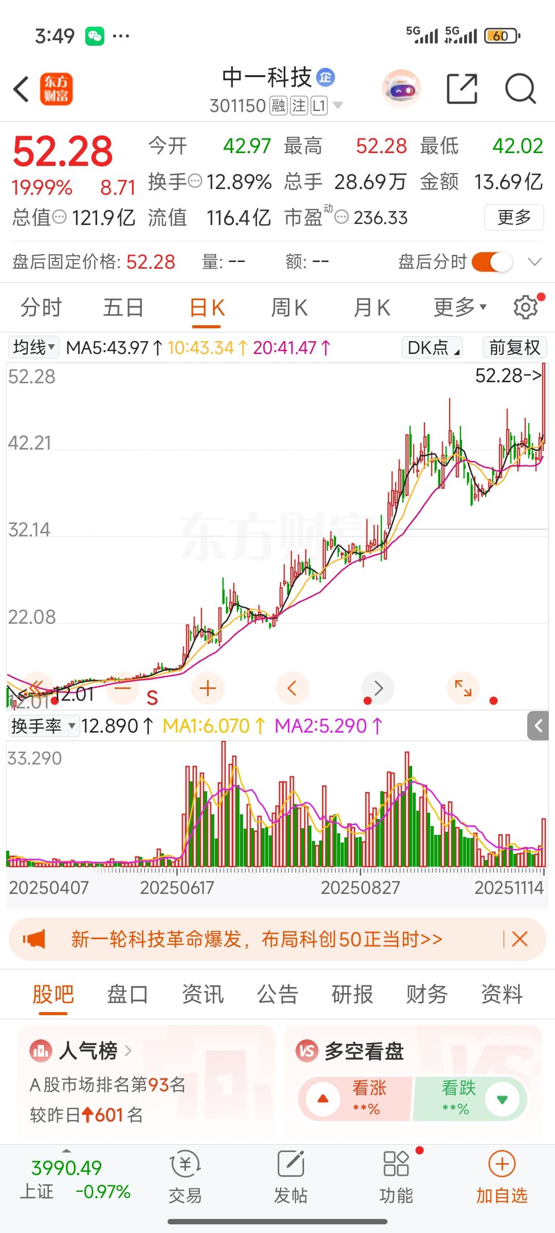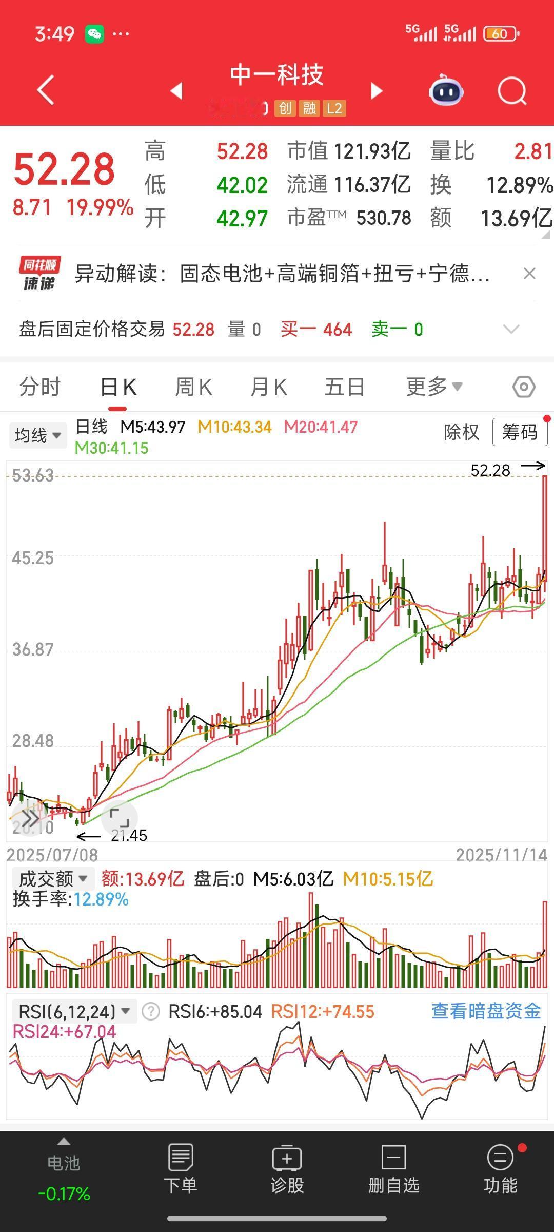中一科技,在今日大盘调整、绝大多数股票下跌之际,逆势放量,强势涨停,成功突破高位