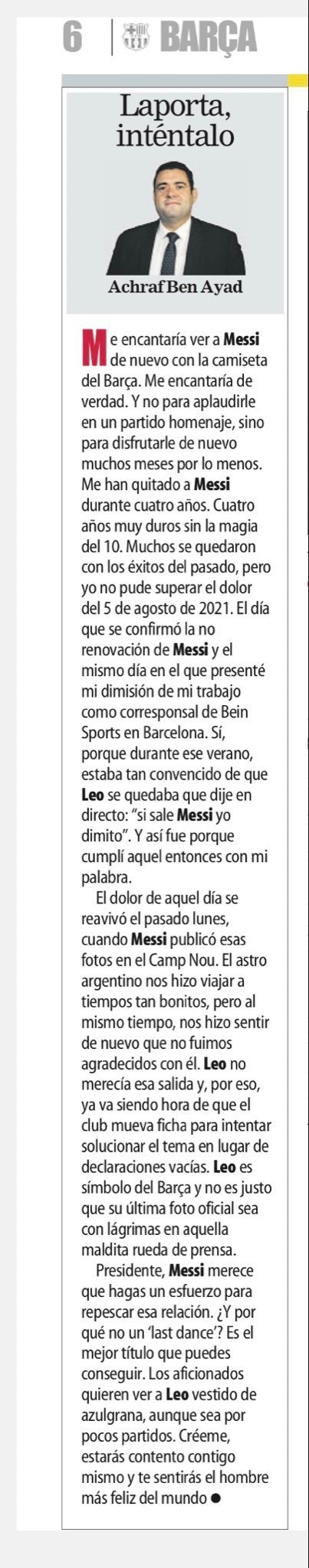 世体记者:拉波尔塔,试试! 我渴望再次看到梅西身披巴萨球衣。真的,我渴望如此。不仅仅是在告别赛上,而是至少能再欣赏他几个月的风采。他们让我失去了梅西四年。没有10号魔力的四年,无比艰难。很多人只记得过去的辉煌,但我却始终无法释怀2021年8月5日的苦涩。那天,梅西的合同没有续签,也是我从巴塞罗那beIN SPORTS记者岗位上辞职的日子。是的,因为那年夏天,我坚信梅西会留队,甚至直言不讳地说:“如果梅西离开,我就辞职。”而事实也正是如此,因为我信守了诺言。 上周一早上,梅西在诺坎普球场发布的照片再次揭开了那一天的伤痛。这位阿根廷球星唤起了我们美好的回忆,但同时也让我们再次感到,我们曾经对他不够感激。梅西不应该离开,俱乐部应该采取行动,努力解决问题,而不是发表空洞空口的声明。梅西是巴塞罗那的象征,他最后一张官方照片竟然是在那场决定命运的新闻发布会上痛哭流涕,这实在是不公平。 拉波尔塔先生,梅西值得您为重建这段关系所做的努力。为什么不跳支庆祝舞呢?这是您能赢得的最好的荣誉。球迷们都想看到梅西身披巴萨战袍,哪怕只是几场比赛。相信我,您会为此感到骄傲,并且觉得自己是世界上最幸福的人。