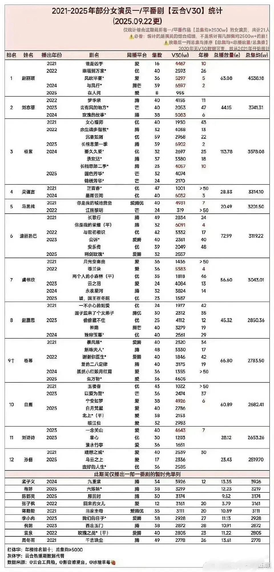 2021-2025年云合v30女演员中赵丽颖断层第一,不愧是金鹰飞天视后,太厉害了!