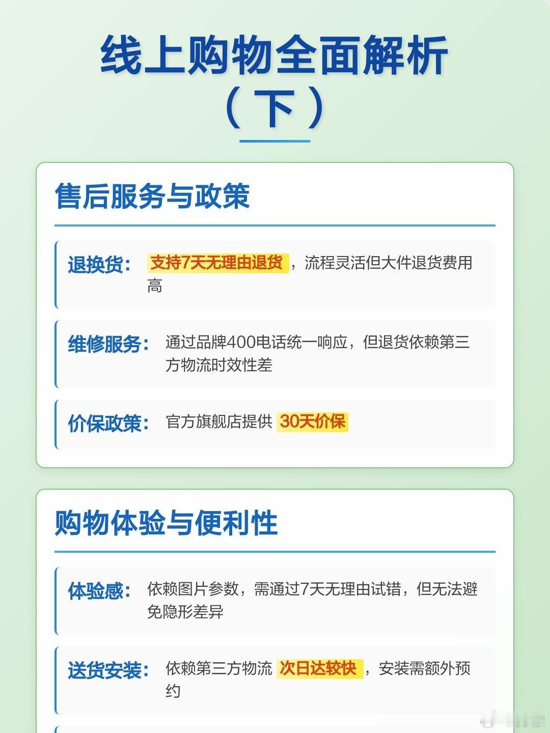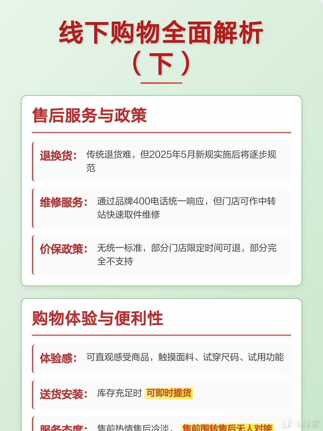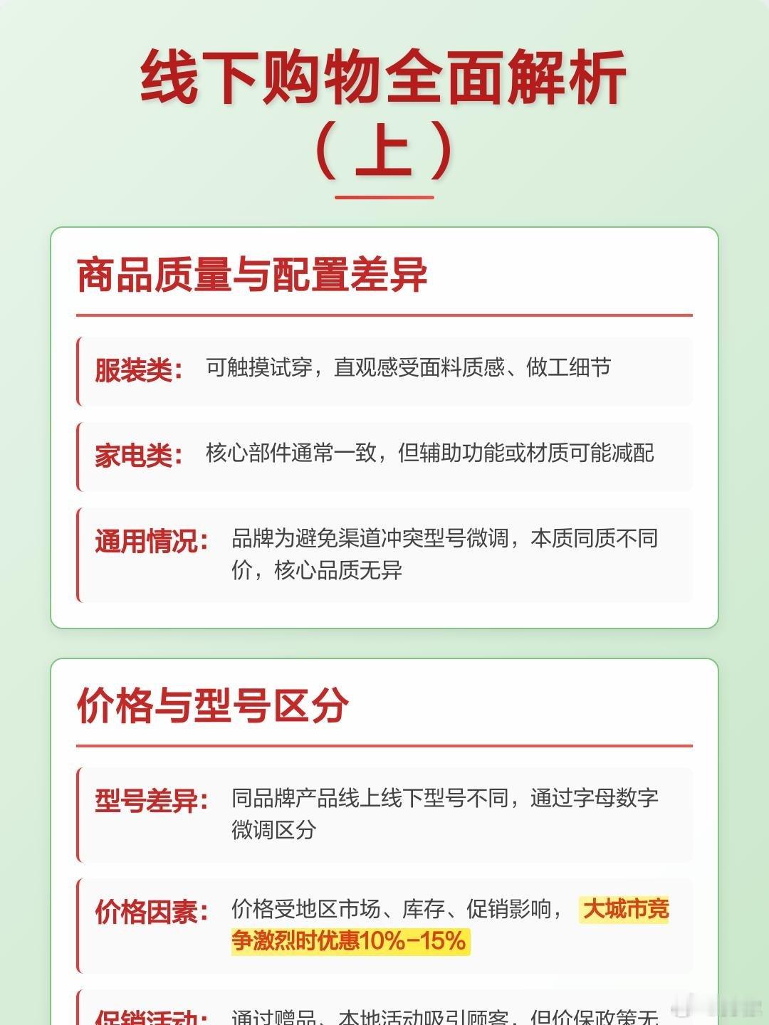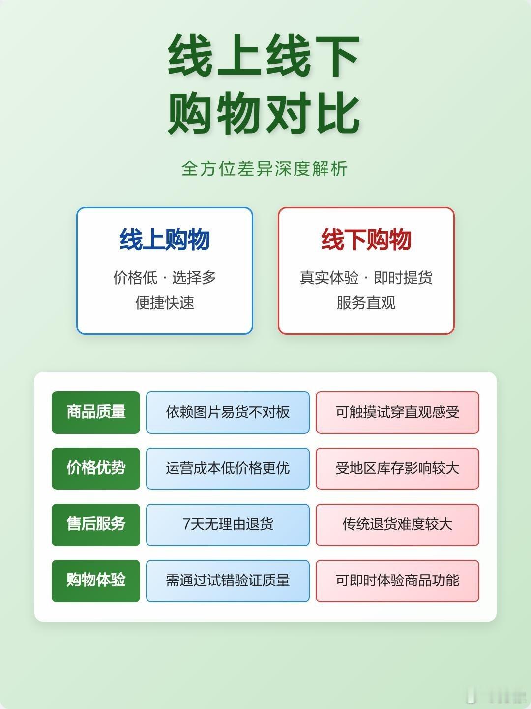 线上线下购物对比差异全解析线上线下买东西,这些年我踩的坑能写本攻略了。每次在商场和手机前选,都像玩风险和收益的博弈。📌先说衣服这类贴身的。店里能摸面料质感,棉麻哑光和化纤反光差别大。试穿能看做工细节,手工刺绣和印刷图案不一样。网购全靠图片,常货不对板。版型松垮还好,最怕颜色偏差,图片减龄粉,到手老气白,这种落差真难接受。👗家电这类大件更纠结。核心部件比如电机、能效等级通常一样,但辅助功能常被减配。空调遥控器界面简化,冰箱保温层从5cm变3.5cm,洗衣机少了滚筒倾斜调节。有些电商专供款是低质产品,运气差还可能遇到售后翻新机。品牌为了平衡渠道,会微调线上线下型号,本质同质不同价。电商专供款通过简化包装、调颜色来降成本,核心品质不一定差。📺价格和型号的猫腻也多。同品牌产品用字母数字区分,核心功能相似但型号不同,消费者没法直接比价。线上运营成本低,价格通常更优惠。线下价格受地区影响大,大城市竞争激烈能便宜10%-15%,有些商品跨市买能省1-3万。但供不应求时,线下反而可能加价。💸促销活动各有优势。线上常有专属优惠,比如直降700元还带30天价保。线下爱送赠品,保养套餐、汽车精品这些,本地店庆活动也划算。但线下价保政策不统一,有的7天全退,有的完全不退,买前得问清楚。🎁退换货政策差异最大。线上支持7天无理由,流程灵活但大件退货运费高。线下传统退货难,不过明年5月新规实施后会规范些。现在有些门店把无理由退货当促销,实际执行差别大。🔙维修服务倒越来越一样。线上线下都通过品牌客服统一响应,但线下门店能当取件中转站,处理更快。线上退货要等第三方物流,偏远地区特别耽误时间。价保政策线上更透明,官方旗舰店基本都提供30天价保。线下看门店,有的限定时间,有的完全不支持,得自己争取。🔧购物体验这块,实体店优势明显。能摸面料,试尺码,试功能,这种实感难替代。线上购物像开盲盒,得靠7天无理由试错,但有些差异收到货才发现,比如洗涤体验、实际质感这些。🛍️送货安装各有利弊。实体店库存足能当场提货。线上依赖物流,快的次日达,安装要另外预约。有些平台提供一条龙服务,但偏远地区可能覆盖不到。服务态度也有意思,实体店售前热情售后冷淡,线上客服可以投诉,规范性强些,但小店客服可能不太管事。🚚这些年我总结的经验:小件衣物适合线下买,大件家电要仔细比价。促销季多关注线上活动,急用的东西还是实体店靠谱。最重要的是保留好购物凭证,退换货时能省很多麻烦。你们平时更喜欢哪种购物方式?有没有遇到过特别坑的经历?💡