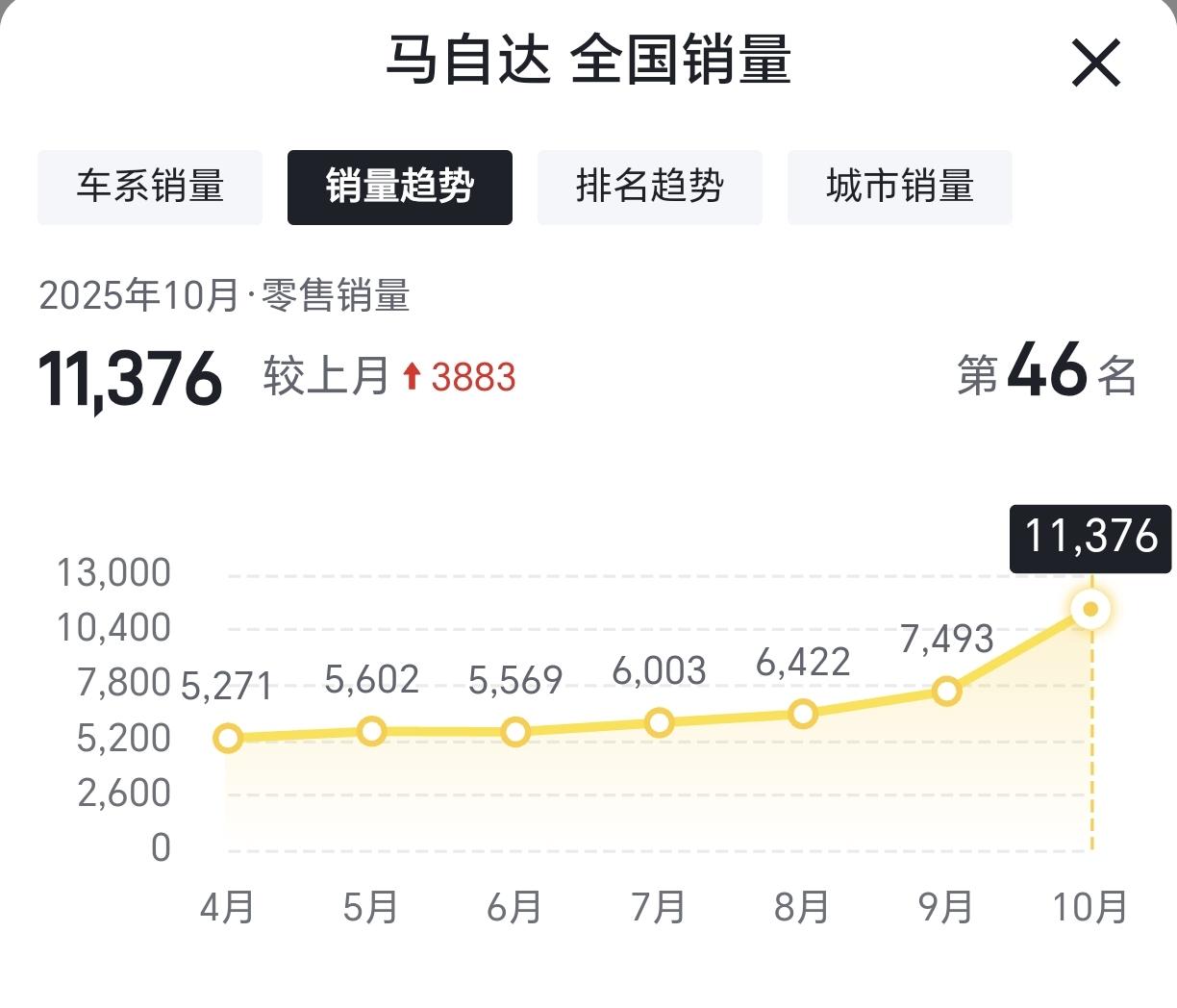 不管你信不信,这就是事实! 6月,马自达在中国卖了5569辆 7月,马自达在中国卖了6003辆 8月,马自达在中国卖了6422辆 9月,马自达在中国卖了7493辆 10月,马自达在中国卖了11376辆 最近几个月,马自达在中国销量持续上涨,10月份销量更是自2023年12月以后首次单月销量破万。 2025年1-10月马自达在中国市场累计销量为6.84万辆,同比增长11.7% 这是马自达自2017年以来首次增长。 看了去年的销量,很多人都在说马自达要退出中国了,但是马自达依托中国市场,迅速完成了转型。10月份新能源汽车销量6877辆,渗透率高达60%,这应该是所有合资品牌里最高的。
