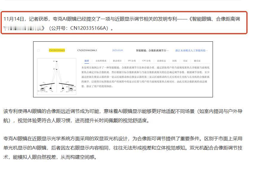 没想到在AI眼镜领域,国外科技巨头不但绕不开中国供应链,就连技术上也要被我们超越! 现在Meta、苹果等国外科技巨头都在加速布局AI眼镜赛道,中国企业也在发力。可能有人担心,我们在AI发展上落后了一些,现在到了AI硬件层面的比拼,中国AI眼镜能不能顶住压力。 事实上,我们还是有很多优势的,比如强大的供应链。之前看过一个报告,是说全球智能眼镜供应链中有超过80%的公司来自中国,所以国产AI眼镜的发展已经有供应链上的优势。 而且就目前来说,国产AI眼镜的技术实力也丝毫不逊色国外。最近夸克AI眼镜就接连曝光了多项核心专利,合像距调节技术就是其中之一。 不知道大家有没有想过一个问题,我们在室内和室外这两种不同的场景中去佩戴AI眼镜,显示屏呈现的视觉显示距离应该是不一样的,如果显示位置把控不好根本无法做到长时间佩戴。 换句话说,如果不管什么场景,眼镜所呈现的虚拟画面距离都是固定的,和实际画面距离对不上,长期用就容易眼酸、头晕。 这么说就懂了吧?有了合像距调节技术,AI眼镜就相当于有了一个“智能视力适配开关”,显示位置应该前一点、后一点,还是上一点、下一点,这些通通能做到像素级精准调节,反正就是能给你调到最适合视觉习惯的位置。而且不同于其他AI眼镜产品所使用的单个显示屏,它能够支持双眼显示,更加符合普通人的用眼习惯,会有更加真实的空间感。 总之,不管用户是需要室内提词,还是要到户外远距离导航,夸克AI眼镜都能实现无缝切换。 其实对于AI眼镜这样的产品,佩戴舒适、看得舒服是非常重要的,是其真正走向大众必须要实现的一点。现在中国AI在大模型领域已经追赶上来了,中国AI眼镜背靠强大的中国供应链,并且技术上做到了“人无我有,人有我优”,相信一定能抢占新的技术高地!