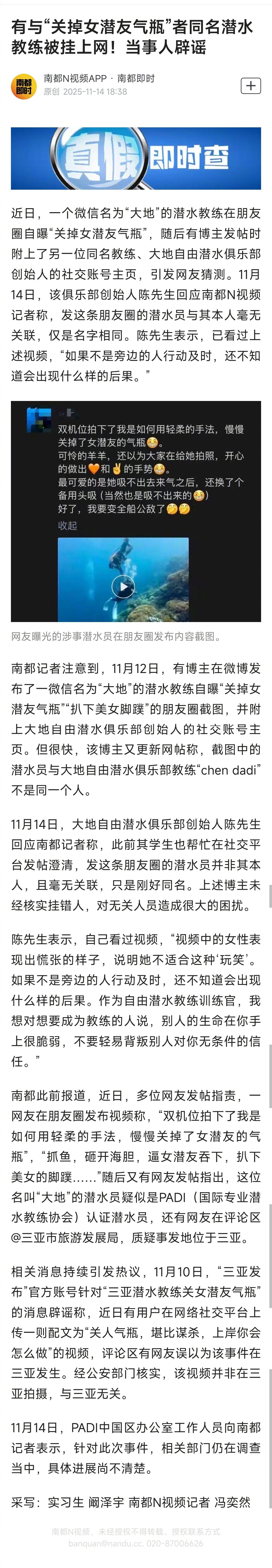 【有与“关掉女潜友气瓶”者同名潜水教练被挂上网!当事人辟谣】近日,一个微信名为“大地”的潜水教练在朋友圈自曝“关掉女潜友气瓶”,随后有博主发帖时附上了另一位同名教练、大地自由潜水俱乐部创始人的社交账号主页,引发网友猜测。11月14日,该俱乐部创始人陈先生回应南都N视频记者称,发这条朋友圈的潜水员与其本人毫无关联,仅是名字相同。陈先生表示,已看过上述视频,“如果不是旁边的人行动及时,还不知道会出现什么样的后果。”南都记者注意到,11月12日,有博主在微博发布了一微信名为“大地”的潜水教练自曝“关掉女潜友气瓶”“扒下美女脚蹼”的朋友圈截图,并附上大地自由潜水俱乐部创始人的社交账号主页。但很快,该博主又更新网帖称,截图中的潜水员与大地自由潜水俱乐部教练“chen dadi”不是同一个人。11月14日,大地自由潜水俱乐部创始人陈先生回应南都记者称,此前其学生也帮忙在社交平台发帖澄清,发这条朋友圈的潜水员并非其本人,且毫无关联,只是刚好同名。上述博主未经核实挂错人,对无关人员造成很大的困扰。陈先生表示,自己看过视频,“视频中的女性表现出慌张的样子,说明她不适合这种‘玩笑’。如果不是旁边的人行动及时,还不知道会出现什么样的后果。作为自由潜水教练训练官,我想对想要成为教练的人说,别人的生命在你手上很脆弱,不要轻易背叛别人对你无条件的信任。”