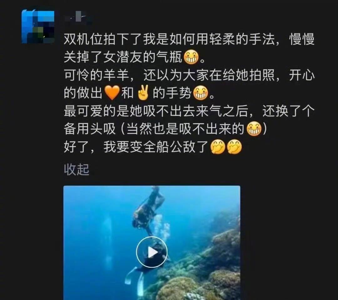 【有与“关掉女潜友气瓶”者同名潜水教练被挂上网!当事人辟谣】近日,一个微信名为“