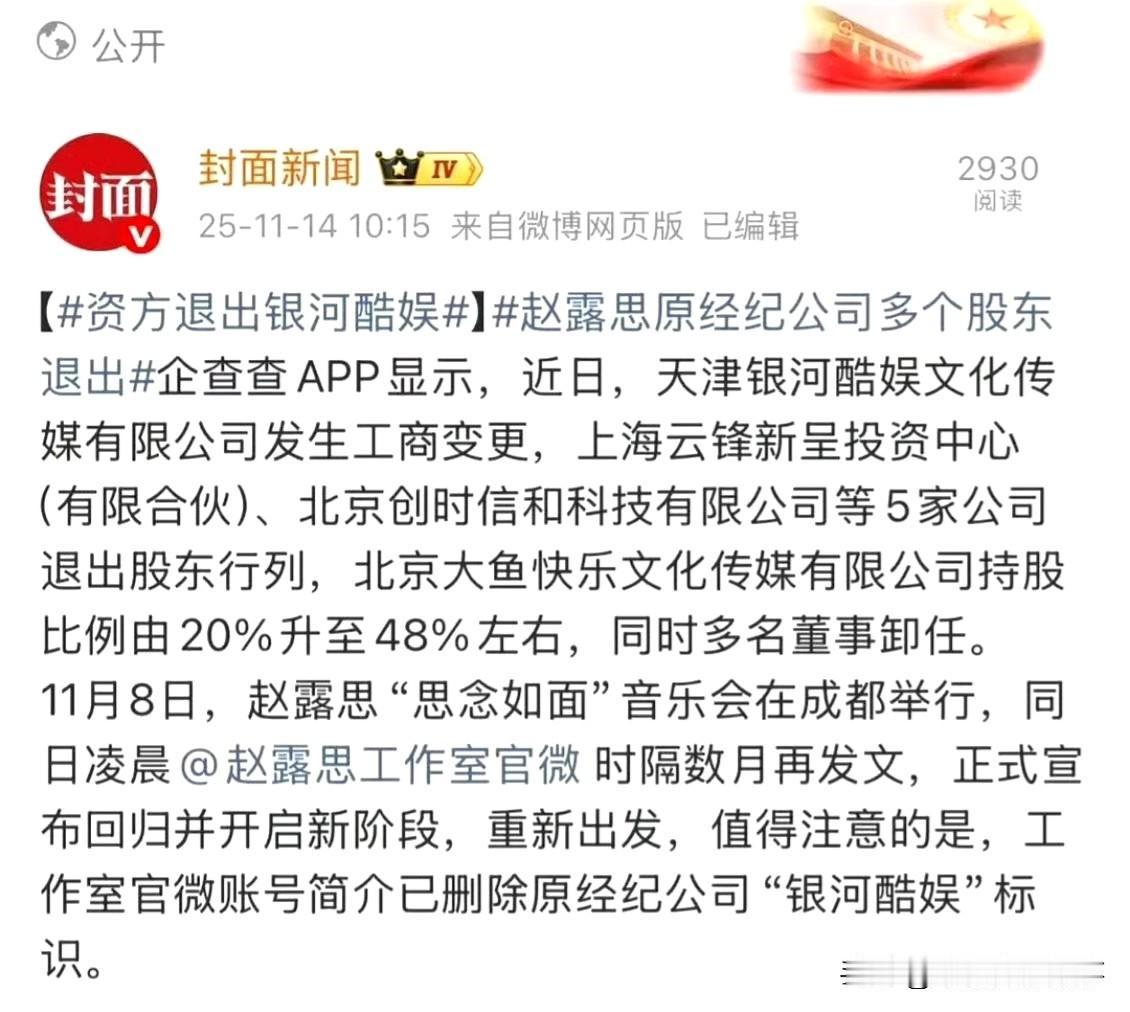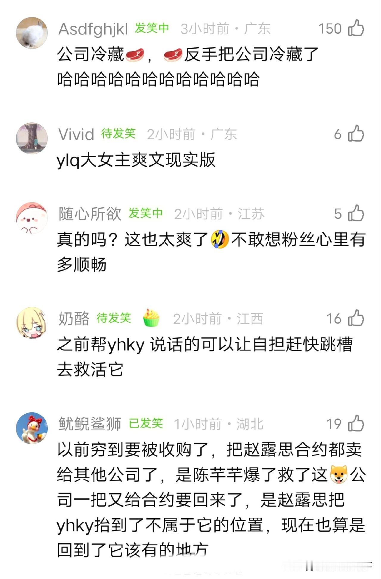 《赵露思:内娱爽文女主照进现实》 赵露思与银河酷娱的“双向冷藏”,活成了晋江文照进现实的名场面:曾靠她《陈芊芊》盘活的公司,如今随她解约陷入股东撤离的困局。 从被冷藏到亲手“送”公司回归原点,这波“回旋镖”操作,让粉丝直呼“真花粉天堂”——顶流女星的底气,从来不是依附,而是自己活成了最大的资本。