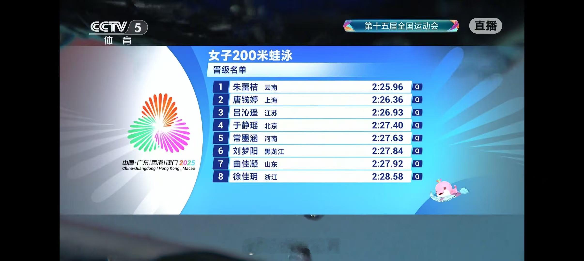 女子200米蛙泳半决赛1.朱蕾桔 2:25.962.唐钱婷 2:26.363.吕沁遥 2:26.934.于静瑶 2:27.405.常墨涵 2:27.636.刘梦阳 2:27.847.曲佳凝 2:27.928.徐佳玥 2:28.58 半决赛前8名晋级决赛9.叶诗文 2:28.66 遗憾卡9无缘决赛