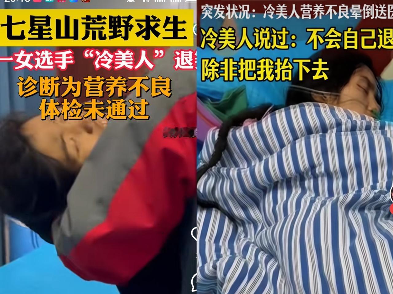 冷美人突然退赛了, 但我想对她说声“恭喜”, 虽然有遗憾,但更多的是 她赢过了太多人,也有很多人记住了她 谁看冷美人被抬走时的样子不惊讶,36天啃野菜、扛两次生理期剧痛,说“除非抬我下去”的人真被抬走了,网友弹幕直接炸:“这才是冠军!” 她是把“女性不该被框住”砸进了荒野之中。赛前被骂“做美甲来作秀”,赛中吃鼻涕虫被嘲“装坚强”,结果她靠野菜撑到体重掉20斤,用晕倒撕碎“内定”谣言。让大家看到了,她是优秀的! 还是多保重身体吧!