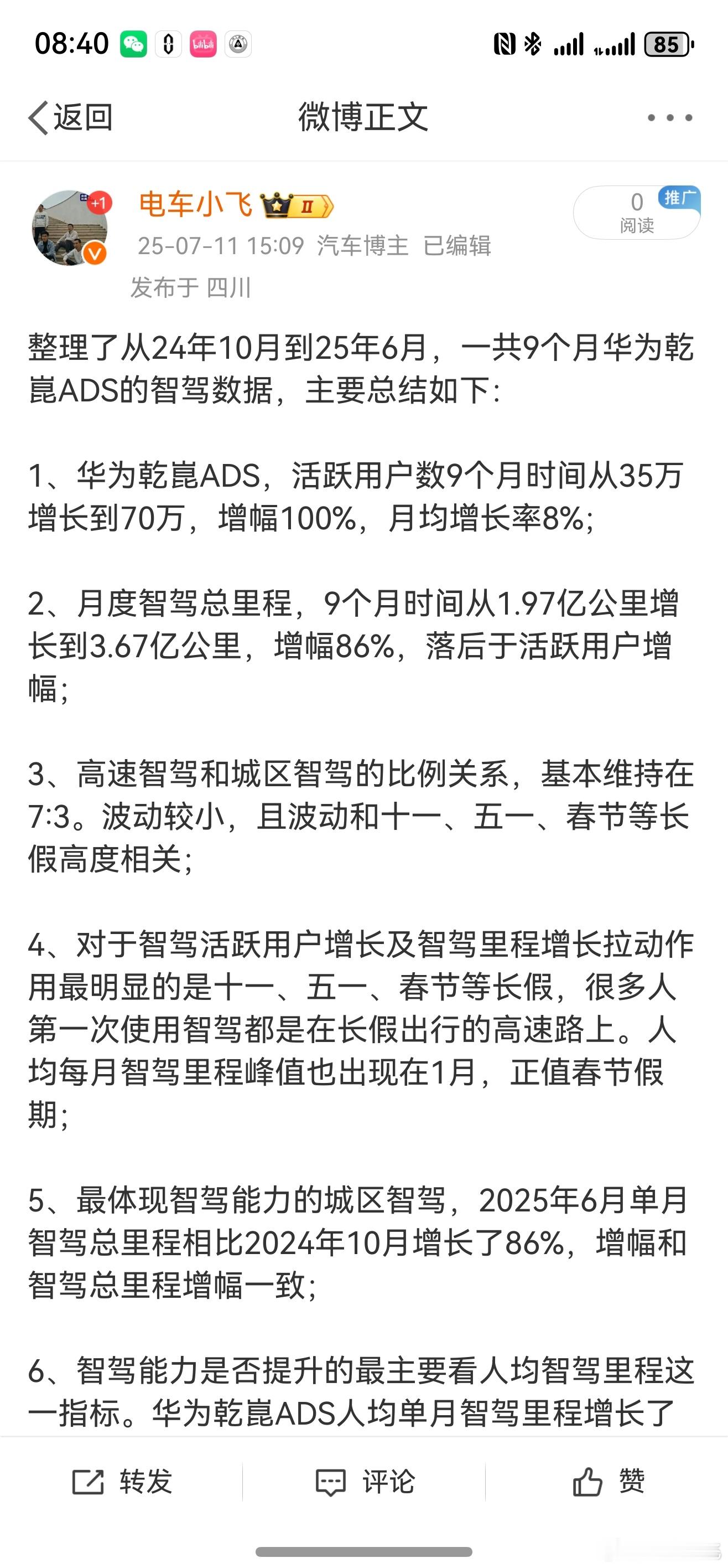 我一直说对于智驾活跃用户增长起到最大作用的就是长假。放长假出门高速为主,有好用的智驾,大家一定会打开用的