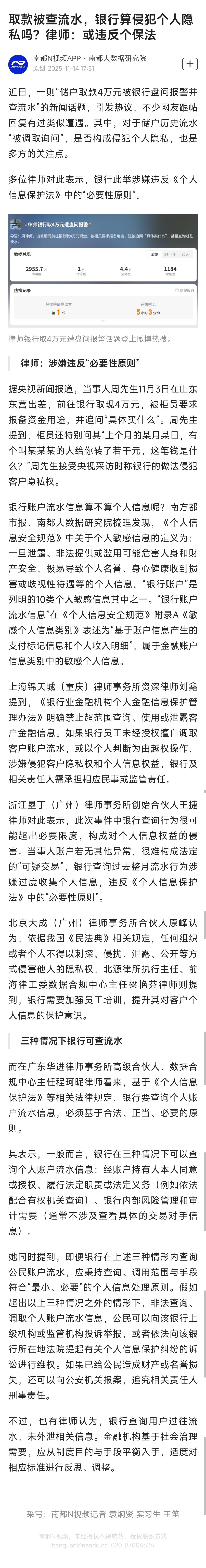 【取款被查流水,银行算侵犯个人隐私吗?律师:或违反个保法】近日,一则“储户取款4万元被银行盘问报警并查流水”的新闻话题,引发热议,不少网友跟帖回复有过类似遭遇。其中,对于储户历史流水“被调取询问”,是否构成侵犯个人隐私,也是多方的关注点。多位律师对此表示,银行此举涉嫌违反《个人信息保护法》中的“必要性原则”。