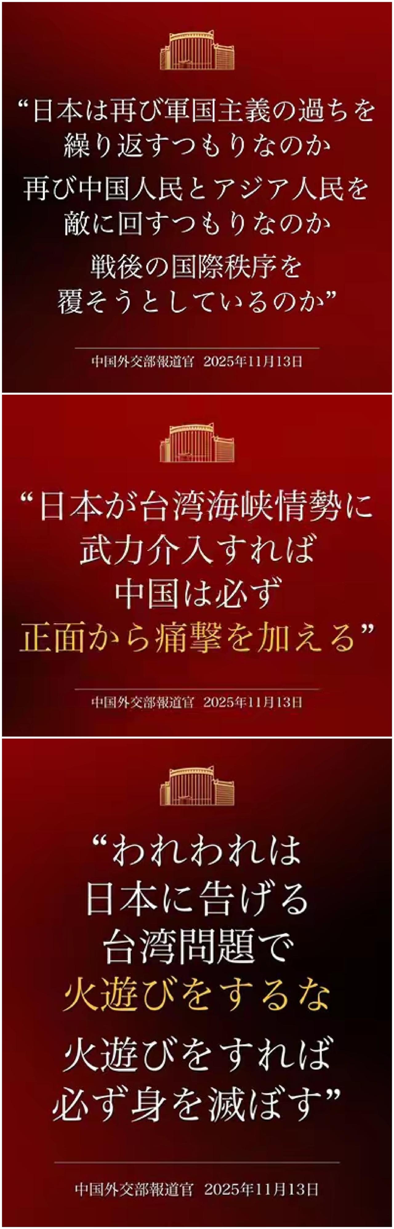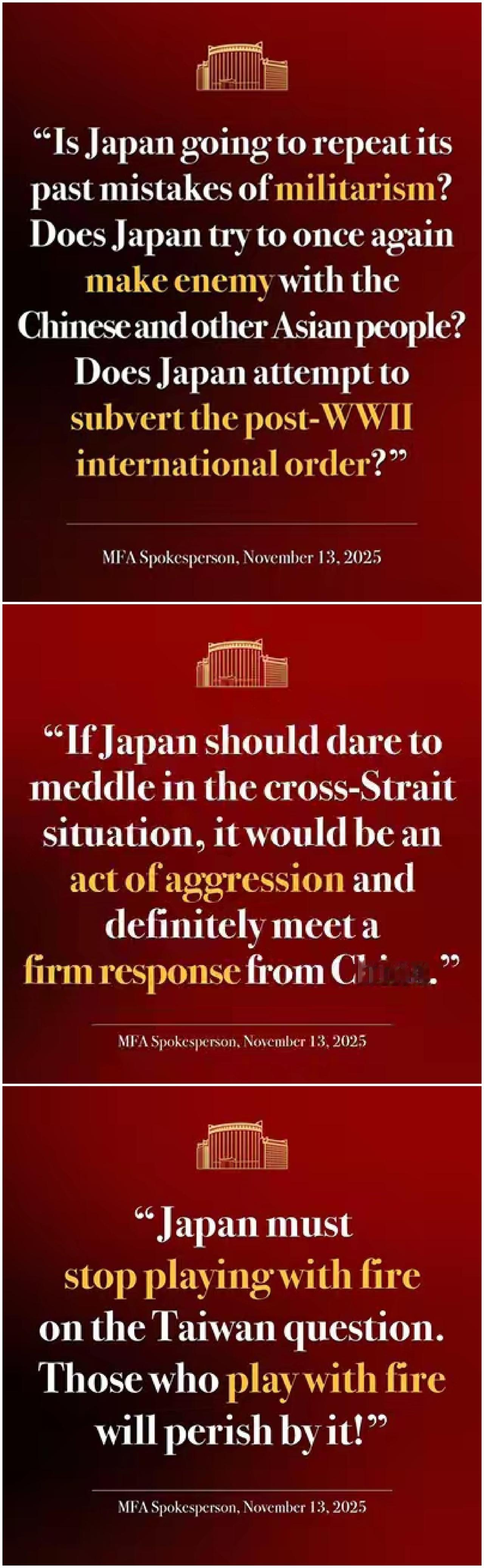 外交部使用日英双语连发三问:“日本是否要重蹈军国主义覆辙?是否要再次同中国人民和亚洲人民为敌?是否企图颠覆战后国际秩序?” 从搞事早苗扬言武力介入台海开始,到防卫省官员威胁“优先击沉”福建舰,再到现在驻澳大利亚大使竟然宣称“日本从没承认一中”。这一层层的舆论造势,正如外交部的三问,这是想重走军国主义老路?想与中国人民开战?想颠覆二战后国际秩序? 来看看现今中日账面上的军事实力对比: 1、兵力规模: 中国:现役约200万人,预备役约510万 日本:现役约24.7万人,预备役约5.6万 2、海军规模 中国:舰艇总数730艘(全球第二),总吨位约285.7万吨,包括3艘航母,8艘055型万吨驱逐舰。 日本:舰艇总数155艘,总吨位约76.9万吨,拥有2艘“出云”级准航母。 3、空军规模 中国:战机总数3304架,其中歼﹣20等五代机约400架,拥有战略轰炸机。 日本:战机总数1459架,F-35系列战机约60-150架(含订单),无战略轰炸机。 4、导弹及核力量 中国:拥有完整且先进的弹道导弹、巡航导弹及高超音速导弹体系,具备“三位一体”核打击能力,核弹头约400-600枚。 日本:受和平宪法限制,无核武要依赖美国核保护伞及自身防御系统。 仅纸面上的实力,日本哪来的自信和我们较量?更不用说一旦开战,拥有全球最齐全的产业链工业制造,中国的机器设备一旦全力生产,恢复力、供给力远不是日本所能比拟的。更何况战略金属材料,稀缺金属材料,稀土等涉及高科技军工设备的原材料,绝大部分都是中国生产的,到时断供,日本又能有多少能力生产出来大量符合高科技武器设备需要的材料? 如果仅仅想要依靠《美日安保条约》,把驻日的约5.4万美军拉下水,试问美国愿意或敢不敢在第一岛链与中国打一场近海战?更何况现在中国拥有可以打到美国本土的东方快递,美国敢不敢冒本土被袭击的风险,打一场热战? 抗战结束刚刚80周年,战争中3500万倒在日军刺刀下的军民多希望后辈能给他们血仇。如果现任四处叫嚣的日本政府,敢伸手,敢动刀兵,我们后辈一定会打出一个让先辈满意的结果!打出一片朗朗青天,“旭日”破碎的山河出来! 就问:你们敢吗?