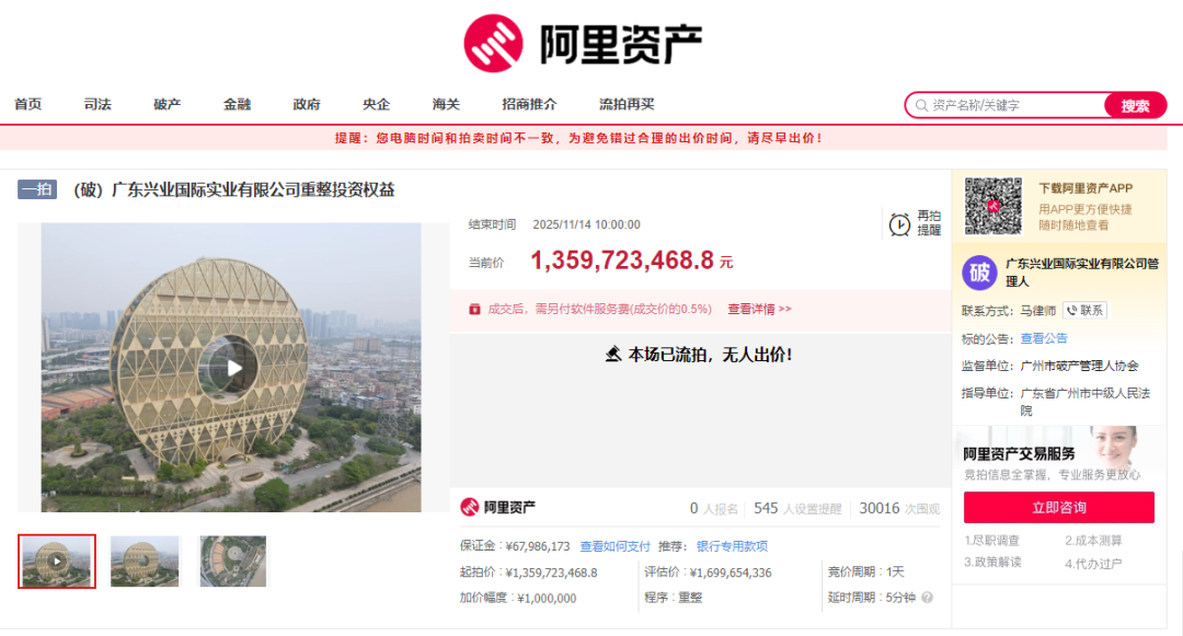 【广州地标建筑“铜钱大厦”第三次拍卖流拍!幕后资方潮汕富豪已成“老赖”】 红星资本局11月14日消息,近日,广州地标建筑广州圆大厦(又名“铜钱大厦”)迎来了第三次上架拍卖。阿里拍卖平台披露的信息显示,11月14日10点,广东兴业国际实业有限公司重整投资权益因无人竞拍而流拍。拍品所有人为广东兴业国际实业有限公司,拍卖原因系破产重整。该项目具体标的物包括2宗土地使用权、3项不动产,以及固定资产。标的主要资产正是广州地标建筑——广州圆大厦。项目评估价近17亿元,打8折后以13.6亿元起拍。拍卖时间为2025年11月13日10时至2025年11月14日10时止,共有545人设置提醒,超3万次围观,但无人报名出价。