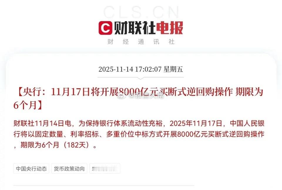 起飞!下周要起飞了!8000亿!8000亿增量资金来了!下午5点02分,据财联社消息,为保持银行体系的流动性充裕,11月17日将开展8000亿元买断式逆回购操作,期限6个月,这个消息对于市场来说是重大利好,太及时了!今日大盘尾盘跳水,失守4000点,市场情绪低迷,甚至不排除尾盘出现了恐慌情绪,恐怕有不少股民都割肉了吧,在这种情况下,央行又及时为市场带来了8000亿的增量资金,这将有利于缓解市场的资金压力,给市场带来稳定性,不出意外的话,这个消息将会点燃下周的市场,给做多的力量带来信心!股民们,坐稳扶好,受央行利好刺激,预计下周一三大指数将低开高走要反包回来了,大盘指数将有望再次收复4000点,满仓的股民们,周末又可以安心过周末了