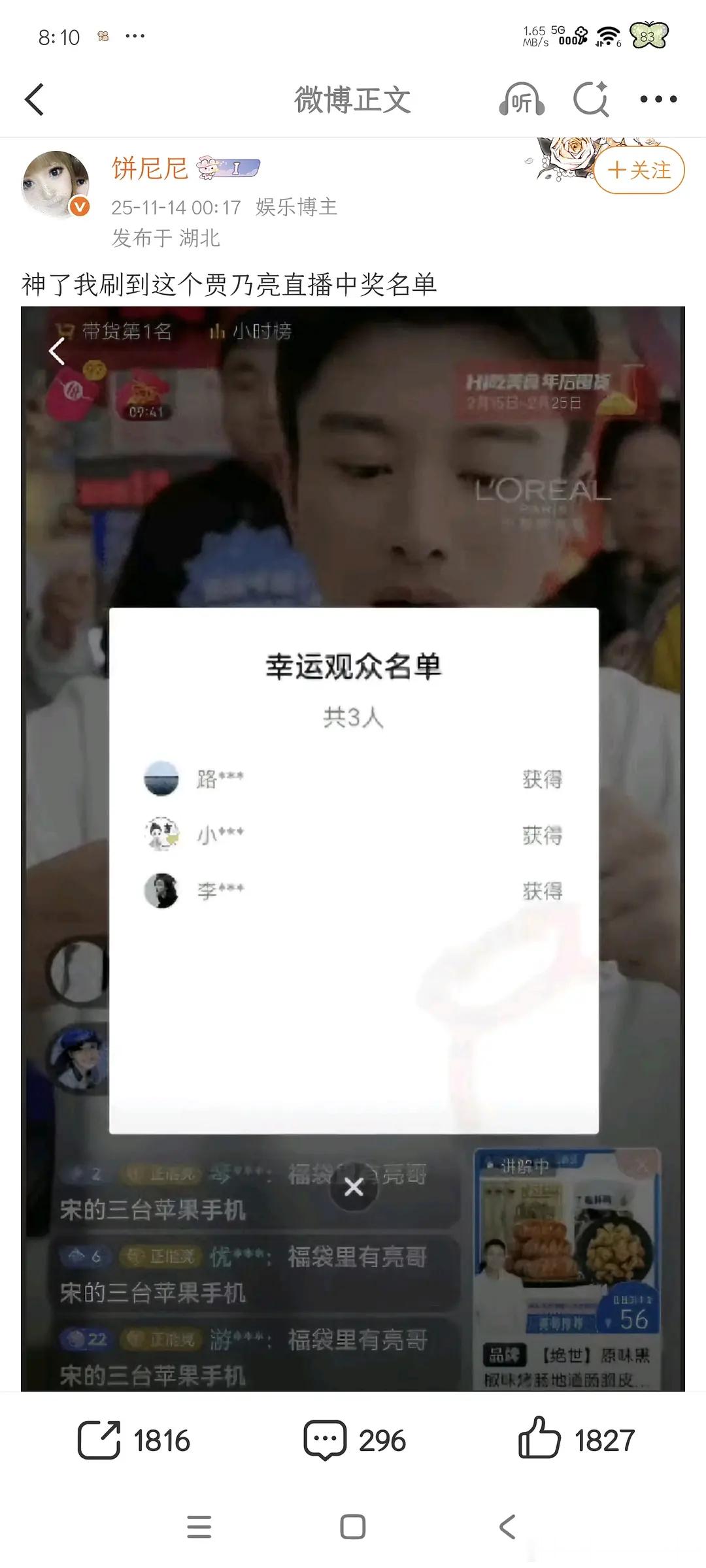 贾乃亮的直播中奖名单,他现在的路人缘都这么差了吗?