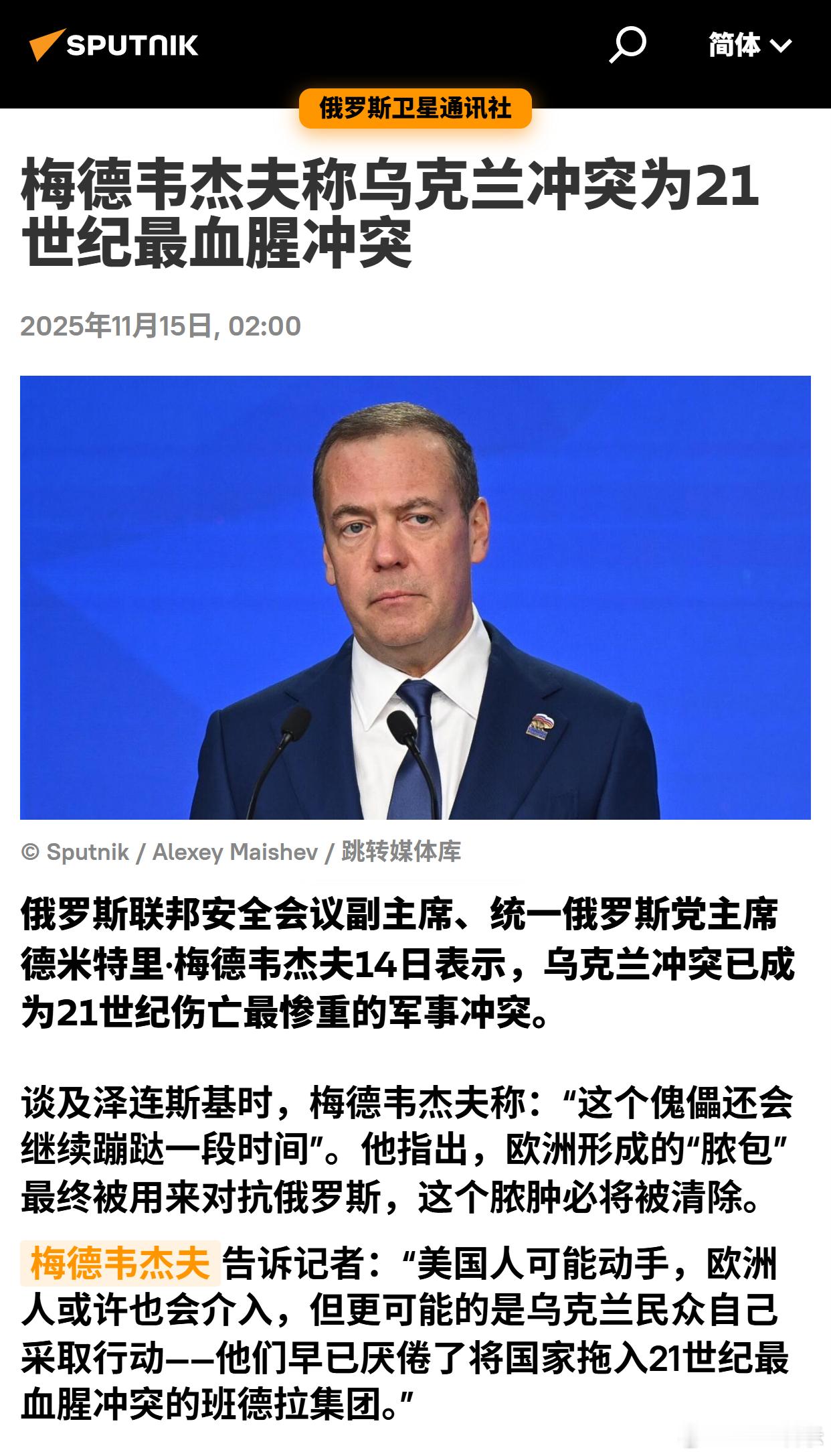 梅德韦杰夫称乌克兰冲突为21世纪最血腥冲突