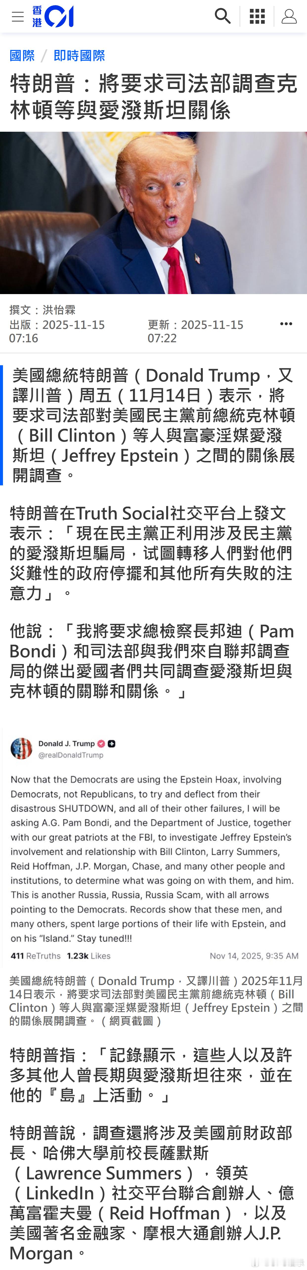 特朗普:将要求司法部调查克林顿等与爱泼斯坦关系