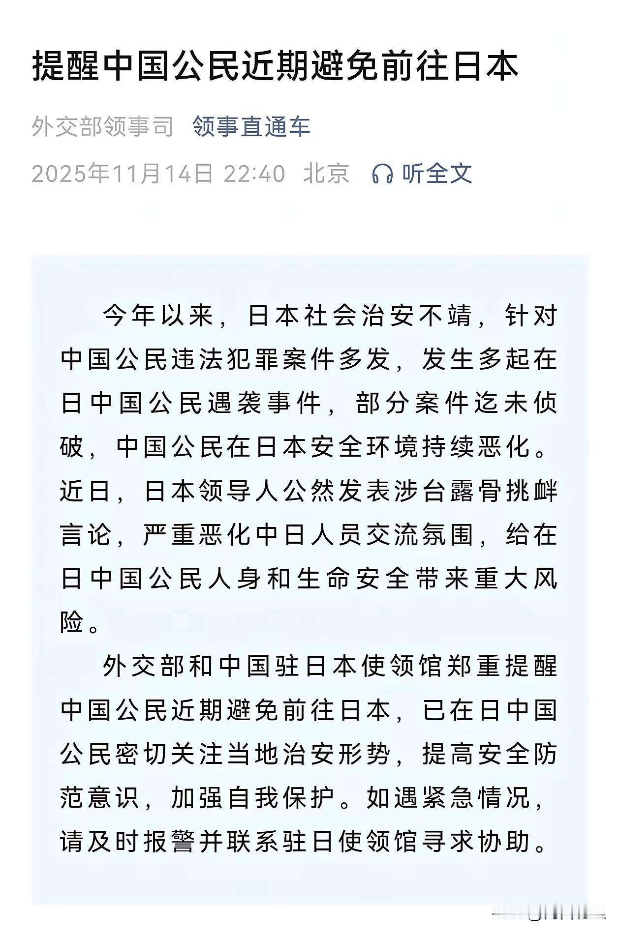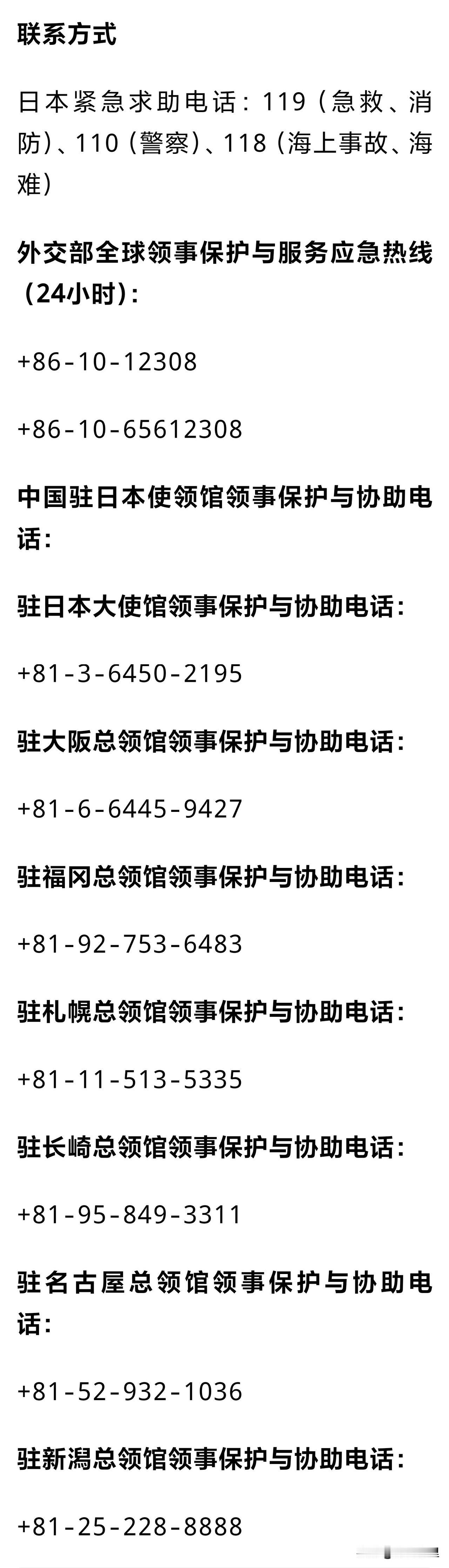 在日安全紧急提醒 日本社会治安持续恶化,针对中国公民的暴力事件频发!2025年以来已发生至少27起恶性袭击,涵盖无差别持械攻击、勒颈抢劫等,且多起案件至今未破。施暴者常带有种族仇恨倾向,作案后警方处理迟缓,司法轻纵现象严重。 更严峻的是,日本领导人近期发表涉台挑衅言论,严重破坏中日交流基础,政治风险直接转化为在日中国公民的安全威胁。 关键风险提示 1、 仇恨犯罪高发: 东京、大阪、京都案件集中度达82% 62%袭击发生在右翼活跃区域,83%伴随歧视性语言 避开高危时段:19:00-23:00(占全日案件67%) 2、 诈骗与信息泄露: 针对留学生的“假绑架”诈骗单案损失高达8000万日元 警惕假冒使馆、公检法的电话诈骗,切勿透露个人信息或转账 3、自然灾害叠加: 日本多地发布极端天气预警,外国游客因未安装防灾APP受困案例激增 紧急防护指南 立即行动: 已在日公民:下载「中国领事APP」登记信息,开启风险推送 保存紧急联络: 日本报警:110|急救消防:119 中国使馆保护热线:+81-3-6450-2195(东京) +81-6-6445-9427(大阪) 说句实在话 安全不是选择题,而是必选项。当一个国家的政客为博眼球践踏国际准则,当街头仇恨犯罪被轻纵成常态,普通人的生命尊严便成了最大牺牲品。此刻,保护自己就是最硬的反抗。 转发提醒: 如果你或亲友在日本,请务必确认安全状态!多一份警惕,少一分风险。 (信息来源:中国外交部、驻日使领馆2025年11月最新通报) 日本安全策略 日本暴力事件 日本寻衅滋事 东京中国人遭袭 日本安全警示