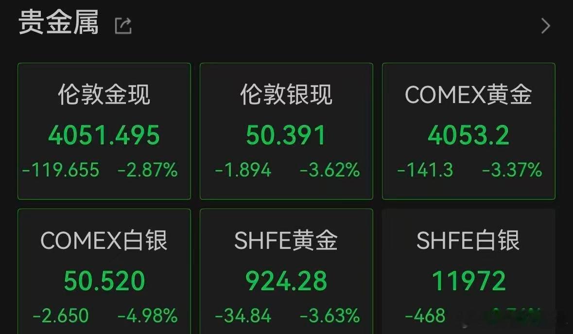 昨晚,现货黄金、白银直线跳水下跌,伦敦金跌到4050美元,日内跌幅近3%,当日一度涨至4200美元以上!