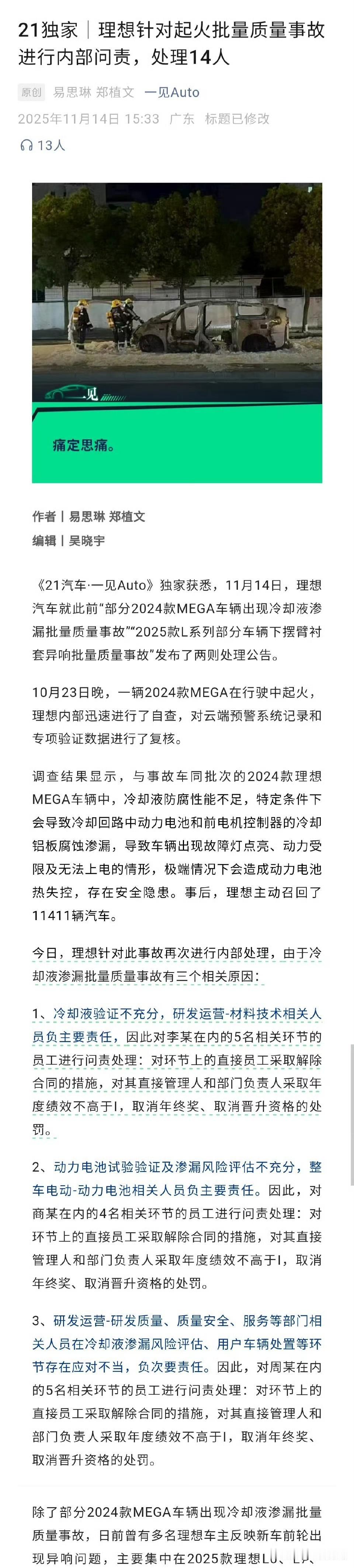 据一见AUTO消息,理想对这次MEGA失火原因内部追责很严肃,一次处理了14个人。 简单来说是材料验证不充分,电池验证不充分,风险评估不充分,而且在用户车辆处置上应对不当。 重则直接解除劳动合同,轻则绩效处理,取消年终奖,取消晋升资格。 不过工程师虽负直接责任,但开发验证周期有没有被压缩值得被各车企考虑。如果周期压缩,设计验证不充足,单靠人拍脑袋去评估风险,什么是高风险和低风险,什么是没有风险。 个人觉得一个全新设计结构、材料、工艺和供应商,只要是设计验证不足的都是有风险的。
