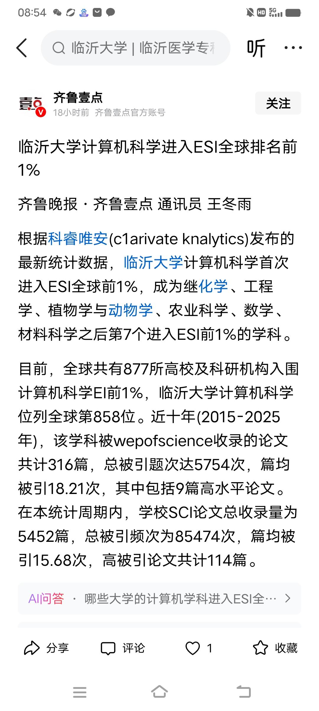 好消息!临沂大学计算机科学进入ESI全球排名前1%,也就是说,临沂大学的计算机专业的实力越来越强,很值得报考了。据悉,临沂大学已经有7个学科进入到ESI全球排名前1%,在普通本科中,这个成绩还是很不错的。欢迎大家留言文明交流!