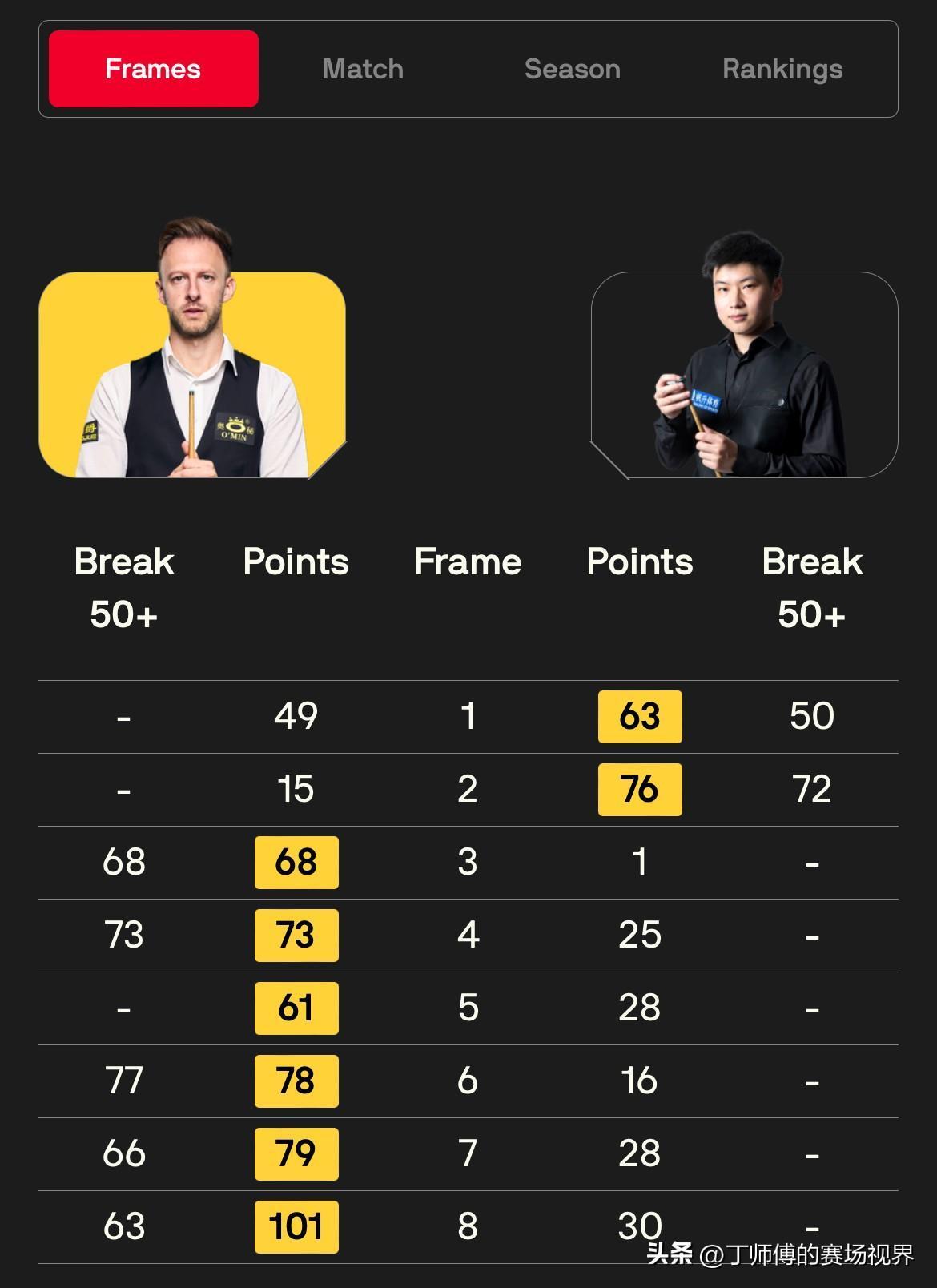 特鲁姆普击败赵心童赛后采访:“从0比2落后的情况下,我就感觉一切都在掌握之中,我的连续得分不错,很少犯错,我很高兴能进入决赛,因为我的状态还没达到100%,可能只有十分之一吧。这赛季我把杆头从黄铜换成了钛合金,感觉很吃力。我感觉很别扭,一点也不流畅,因此每次出杆都必须格外小心。我一直认为如果我发挥出最佳水平,十次里有九次能赢,但过去几年我学会了如何在打得不好的情况下也能赢球。” 特鲁姆普在冠中冠半决赛和赵心童展开两代“准神”之间的较量,世界第一在0比2落后的情况下连赢6局,以6比2击败赵心童晋级决赛,全场两人没有一杆破百,将在决赛对阵塞尔比和罗伯逊之间的胜者。