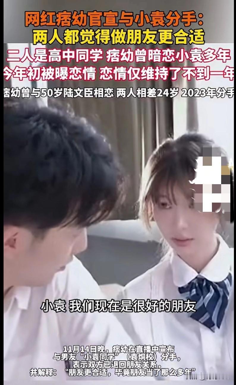 咱就说!网红痞幼刚官宣和小袁同学分手了!!! 他俩可是高中同学啊!痞幼暗恋人家好多年,今年初刚曝恋情,这才不到一年,直接退回朋友关系了…直播里痞幼说“朋友更合适,毕竟当朋友那么多年”,这话说得又甜又扎心是怎么回事! 之前痞幼还和50岁的陆文臣谈过,差24岁呢,2023年分的手。这次和小袁是“从朋友变恋人又变回朋友”,多少人磕过这“青春暗恋成真”的剧情啊! 评论区都炸了:“朋友之上恋人未满,或许是最好的结局?”“暗恋多年在一起又分开,这剧情比剧还抓马!” 咱就是说,成年人的感情真的很微妙,从朋友到恋人需要勇气,退回朋友更需要体面~你们觉得当朋友真的能回到从前吗?