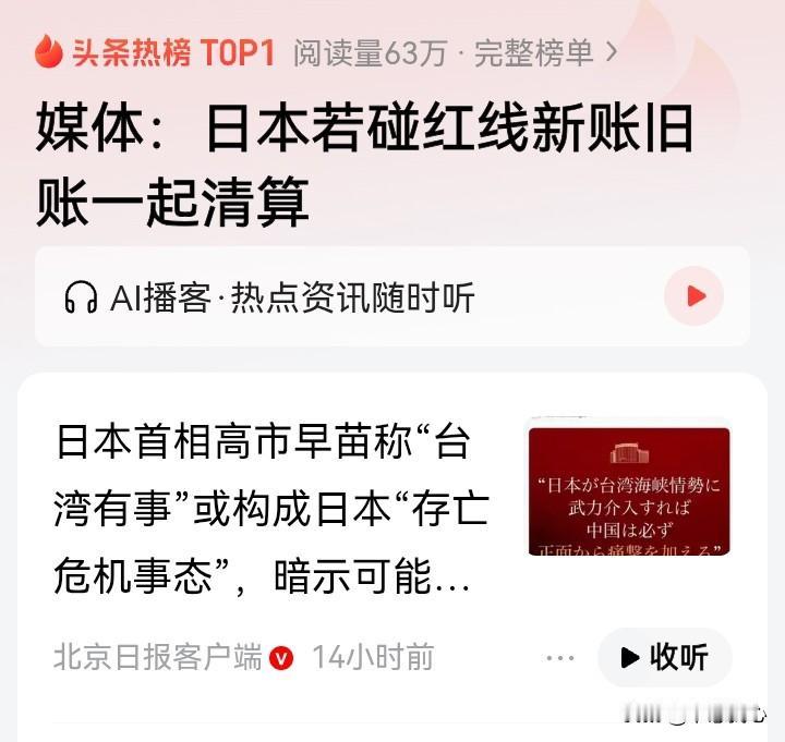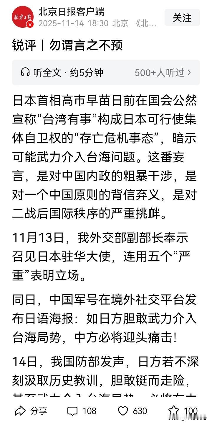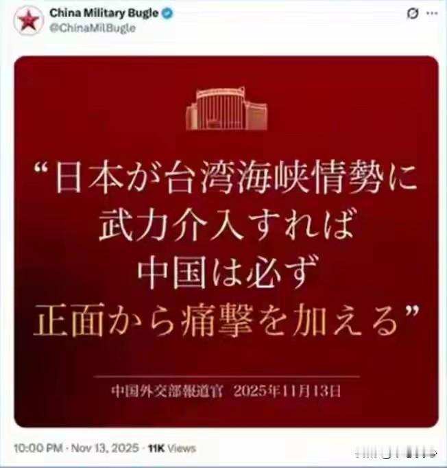 对高市早苗的愚蠢与狂妄,一句“新账老账一起算”,喊出了中国人民的心声! 近日,日本首相高市早苗叫嚣“台海有事”,日本就是“存亡危机”,要行使行使集体自卫权,暗示日本可能武力介入台海问题,阻挠中国统一。 这是要侵害中国核心利益的核心,对14亿中国人民赤裸裸的挑衅啊! 也难怪,日寇发动侵华战争,我们经过14年的浴血抗战,付出3500万人伤亡的惨重代价才取得胜利。 但是,因为历史原因,日本军国主义却没有得到好好清算。80年后,日本社会仍飘荡着军国主义的阴魂,相当一批人冥顽不化、贼心不死,拒绝承认侵略罪行,拒绝接受战败事实,一直在为侵略历史翻案,参拜靖国神厕,为军国主义招魂。 近年来,日本大幅调整安保政策,在强军扩武的错误道路上越走越远,谋求“能战之国”,其狼子野心越发彰显。 好在,今天的中国早已不是之前的积贫积弱,要放在一百年前,我们的外交部、国防部发布对日方这样的批评,早就遭到日寇的军事攻击了…… 今天的中国,有足够的国力军力维护自身领土主权,推进统一势不可挡。无论面对任何挑衅者,中国人民都毫不畏惧! 对高市早苗叫嚣来介入台海,网友满屏的“一言为定”弹幕,很能说明问题:中国的耐心也是有限的,日本持续在危险的边缘疯狂试探,妄图阻挠中国统一,再次侵害中国,那么,我们就新账旧账一起算!