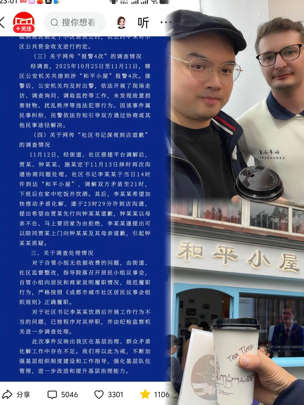 和平小屋后续来了! 书记被停职, 贾某道歉藏 敷衍,马库斯仍寒心! 成都“和平小屋”和解后争议未平:贾某虽按约道歉, 但马库斯坦言“不追赔偿,却难接受其此前态度”,让道歉诚意遭全网质疑。 回顾风波,贾某恶行尽显:驾车压坏展馆地板、险些撞工作人员,还放话“就是要压,挡路该砸”;四次报警、两次调解中,她拍桌索要800元无依据“公区费”,扬言“不交钱就别开馆”。 即便官方通报收费违规、社区书记因酒后履职被停职,她的道歉也只是舆论高压下的勉强应付,网友吐槽“头都不抬,像念稿子走形式”。 马库斯带618张侵华罪证照片自费办展,善意不该被漠视。 和解不是“和稀泥”,仅靠口头道歉难平众怒。 你觉得贾某的道歉该被接受吗? 评论区聊聊! 成都和平小屋