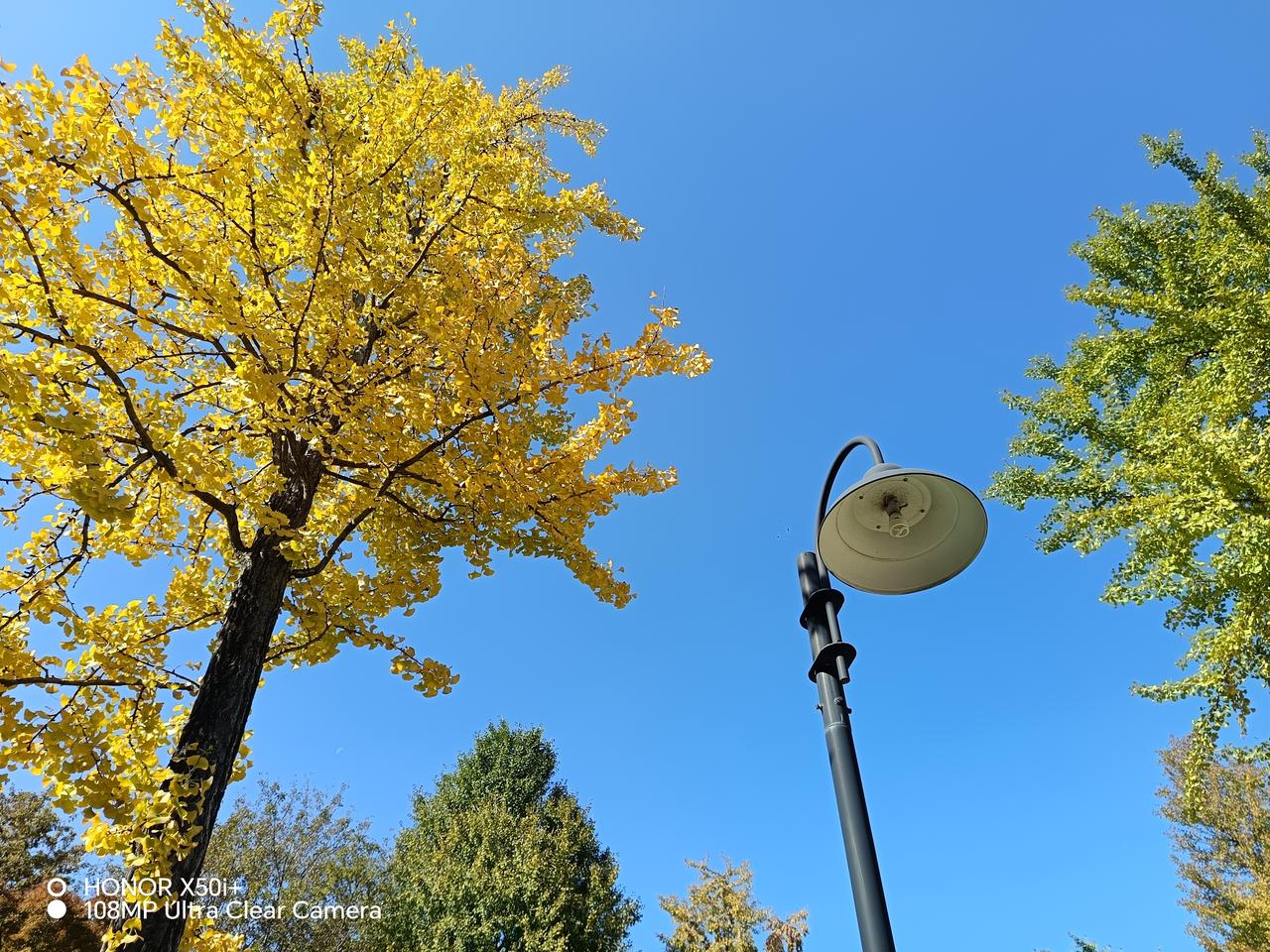 可以分享一张秋景的树叶的照片吗?银杏树叶黄了,摄于桐泾公园内。