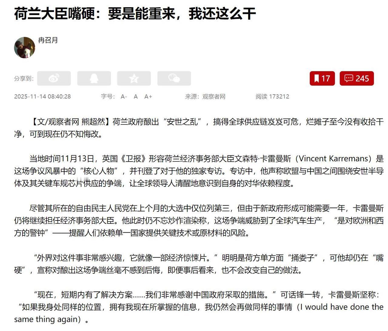 荷兰高官将来华,叫嚣重来一次还要抢,供出背后的靠山,不是美国 中国刚刚展现了最大诚意,率先恢复对欧洲的芯片供应,原本以为剧本会朝着缓和的方向发展,可荷兰此前强制接管安世半导体的余波未平,相关争议仍在发酵。 荷兰经济大臣卡雷曼斯在即将来华谈判的前夕,不但没放下身段,反而放出狠话,话的意思好像是说如果事情重来一次,还是会强行接管安世半导体。 这种硬碰硬的姿态,在国际舞台上算是少见,刚把气氛缓和一点,荷兰又把火苗点起来。 值得玩味的是,此次荷兰行动的背后,并非传统认知中美国的直接授意,而是与美国此前发布的出口管制规则存在关联——美国对安世半导体的母公司闻泰科技追加出口管制后,荷兰随即采取了接管行动。 这一关联让事件更显复杂,表面看是中荷之间的产业争端,实则折射出欧洲国家在中美芯片博弈中的立场摇摆与利益权衡。 芯片供应的这场风波,时间线其实挺有意思。前脚中国恢复对欧洲芯片的出口,德国汽车零部件供应商便确认已获得进口许可,欧洲汽车产业链的紧张态势有所缓解。 但荷兰此前的接管行动已造成实质性影响,就是安世半导体位于广东东莞的工厂已显著减产,作为控股股东的闻泰科技明确表示,恢复对公司“完全的控制权和所有权”是供应链稳定的必要条件。 荷兰政府虽称接管符合“相关法律”,停职公司首席执行官是法院“独立调查的结果”,但这一行动客观上扰乱了全球芯片供应链。 现实很明确,欧洲汽车产业高度依赖相关芯片供应,真要出现供应中断,最先受冲击的就是德国、法国等汽车生产大国。 荷兰自身汽车制造业规模有限,却在半导体关键环节采取激进措施,不少欧洲企业都清楚,此次供应链波动的直接诱因正是荷兰的接管行为。 其实,荷兰此次行动的背后,美国的政策影响格外显眼。据港媒分析,荷兰在9月30日采取接管行动,部分原因是前一天美国政府发布出口管制穿透性规则,对闻泰科技子公司追加同等力度的出口管制。 而德国等欧洲国家的态度则呈现矛盾性:一方面,德国汽车产业高度依赖芯片供应,中国恢复出口后德国企业率先受益。 另一方面,作为欧盟核心成员国,德国未公开反对荷兰的接管行动,客观上形成了对欧洲内部产业保护主义的默许。 这种矛盾本质上源于欧洲国家的双重诉求:既想借助美国主导的技术管制遏制竞争对手,又不愿放弃中国市场和供应链保障。 德国等国的这种立场摇摆,虽非主动“拉偏架”,但也反映出欧盟内部在对华经贸与技术政策上的分歧——产业利益与政治立场难以完全统一。 欧洲各国说是一个整体,其实各自心里都有小算盘,德国等国若长期放任这种产业保护主义行为,日后全球供应链重构时也未必能全身而退。 荷兰这次在错误的路上越走越远,背后其实有三层误判。 第一层是对美国风向的过度追随。尽管最近中美在经贸上有点缓和,但美国国内“芯片威胁论”炒得火热,荷兰随即依据美国新规采取激进行动,试图彰显对美协调立场。 但美国当下更关注内部博弈,对欧洲供应链的实际影响缺乏考量,荷兰这番操作实则加剧了自身与中国的经贸摩擦。 第二层是对欧盟内部共识的误判。荷兰或许认为其行动会获得欧盟成员国的普遍支持,实际上欧盟内部对中国的看法分歧巨大,多数成员国更关心自家企业的供应链安全与市场利益,并不愿意卷入与中国的直接争端。 荷兰自以为符合“西方阵营”立场,殊不知这一立场在欧盟内部缺乏坚实基础。 第三层是对自身筹码的高估。荷兰试图以接管安世半导体资产的方式掌控区域供应链主导权,这种无视中资合法股权的行为,本质上是对市场规则的破坏。 中国恢复芯片供应,是出于维护全球供应链稳定的大局考量,也是给足了协商空间。可荷兰若持续坚持错误的接管立场,迟早会把中国的耐心耗尽。真要是引发供应链进一步反制,荷兰相关产业必将首当其冲。 在芯片这个大局里,荷兰的表演就像小学生违规后不愿纠正,还试图借外部规则为自己辩解。中国这边一直希望合作共赢,荷兰却以“国家安全”为由破坏市场秩序。 主动权始终在中国手里,毕竟中国既有庞大的市场,也有关键的产能支撑。中国让步是为了全球稳定,但如果荷兰不知好歹,迟早会因为自己的错误决策付出代价。 毕竟荷兰再怎么折腾,终究是全球供应链中的一环,真正的出路只有一个,就是把合作当正道,把产业保护和单边行动的那一套收一收。否则,最后只会搬起石头砸自己的脚。 参考资料:荷兰官宣:高级代表团将赴华 2025-11-14 22:04 环球时报