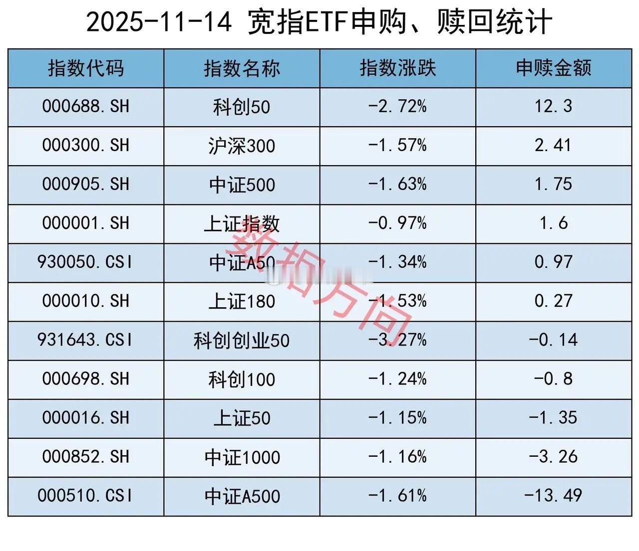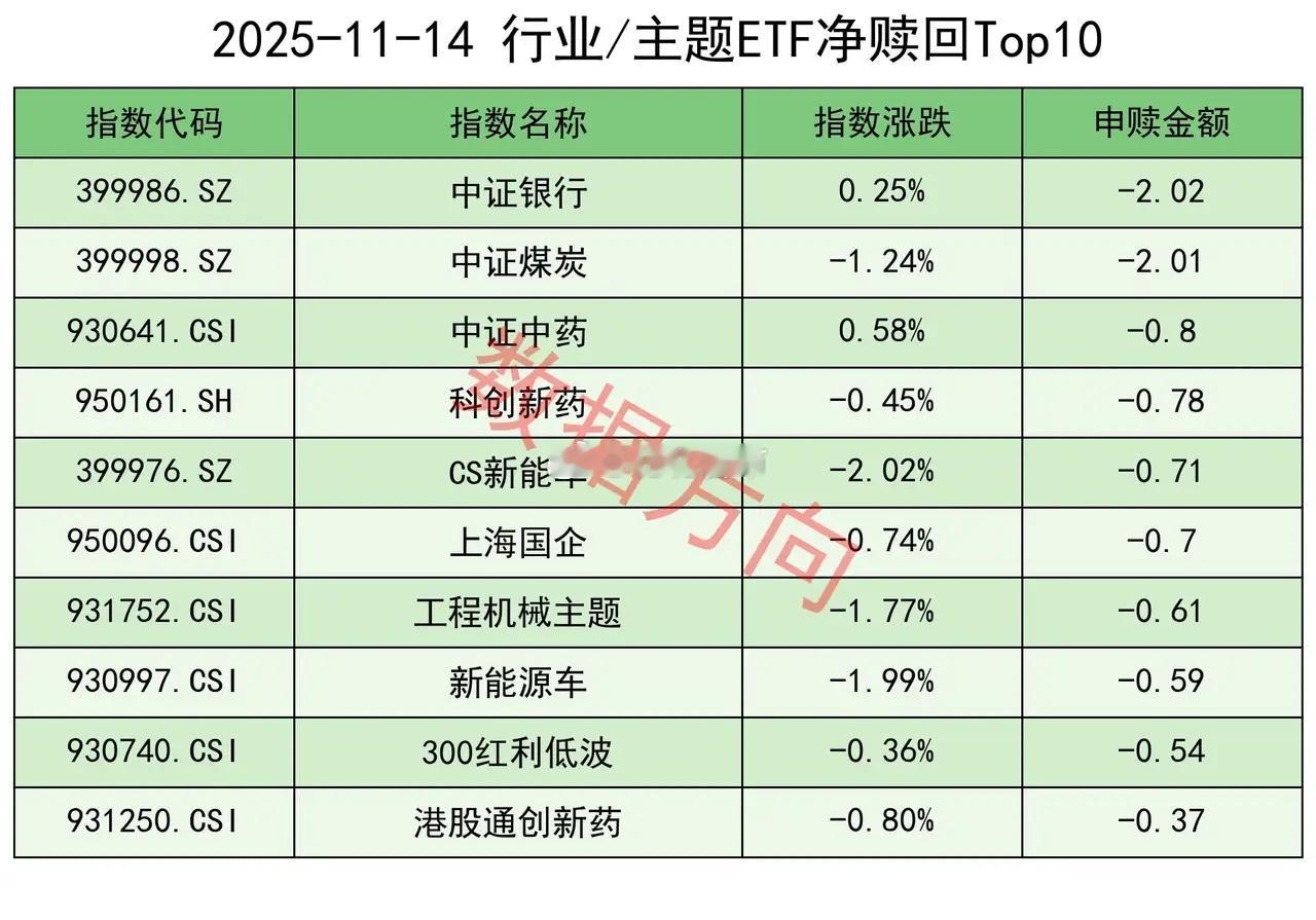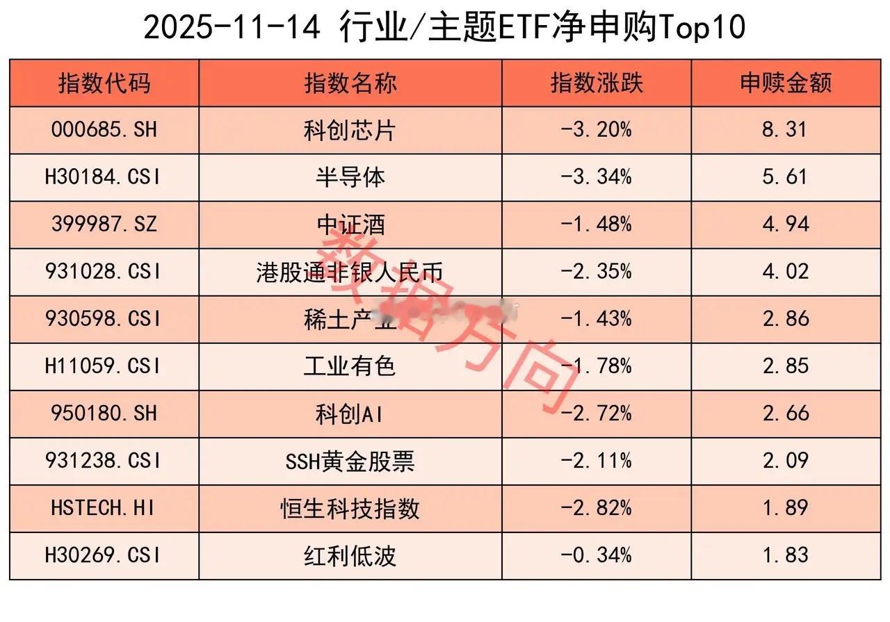 上交所ETF净申购54亿您身边的数据大师,专业分享期指、ETF数据,欢迎关注交流~11月14日星期五,大盘全天震荡下行,尾盘加速下跌,仅有银行、医药等少数行业逆市上涨。上证指数跌幅0.97%,再次失守4000点大关,上交所ETF合计净申购 53.69亿元。宽指科创50指数(12.3亿),净申购超过10亿。指数跌幅较大,不排除主力在做反向套利。沪深300指数(2.41亿)、中证500指数(1.75亿)、上证指数(1.6亿)、中证A50指数(0.97亿)、上证180指数(0.27亿),分别获小幅净申购。中证A500指数(-13.49亿),净赎回超10亿。中证1000指数(-3.26亿)、上证50指数(-1.35亿)、科创100指数(-0.8亿)、科创创业50指数(-0.14亿),分别被小幅净赎回。行业和主题 科创芯片指数(8.31亿)、半导体指数(5.61亿),一起进入申购榜。稀土产业指数(2.86亿)、工业有色指数(2.85亿)、SSH黄金股票指数(2.09亿),一起进入申购榜。其他进入申购榜的还有:中证酒指数(4.94亿)、港股通非银人民币指数(4.02亿)、科创AI指数(2.66亿)、恒生科技指数(1.89亿)、红利低波指数(1.83亿)。中证银行指数(-2.02亿)、中证煤炭指数(-2.01亿)、300红利低波指数(-0.54亿),一起进入赎回榜。中证中药指数(-0.8亿)、科创新药指数(-0.78亿)、港股通创新药指数(-0.37亿),一起进入赎回榜。CS新能车指数(-0.71亿)、新能源车指数(-0.59亿),一起进入赎回榜。其他进入赎回榜的还有:上海国企指数(-0.7亿)、工程机械主题指数(-0.61亿)。