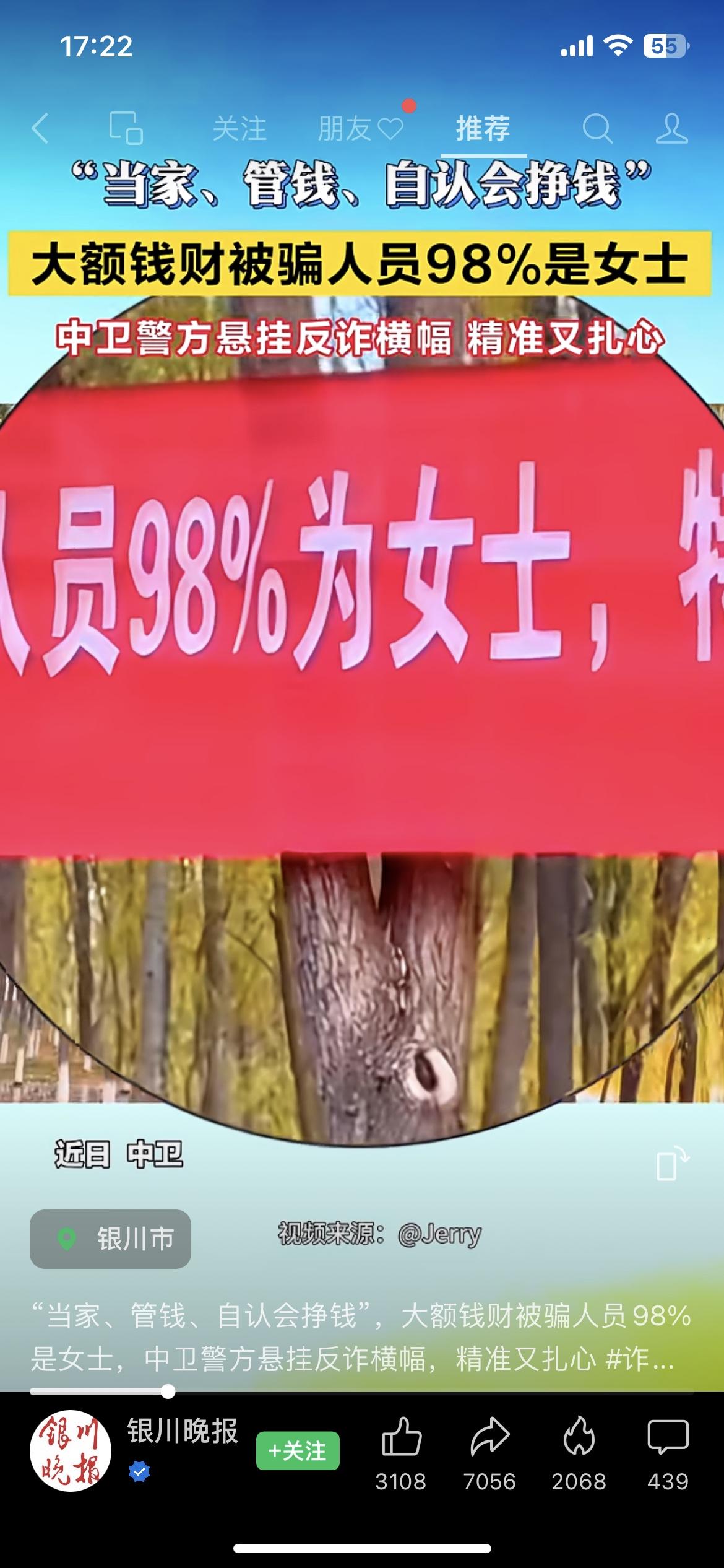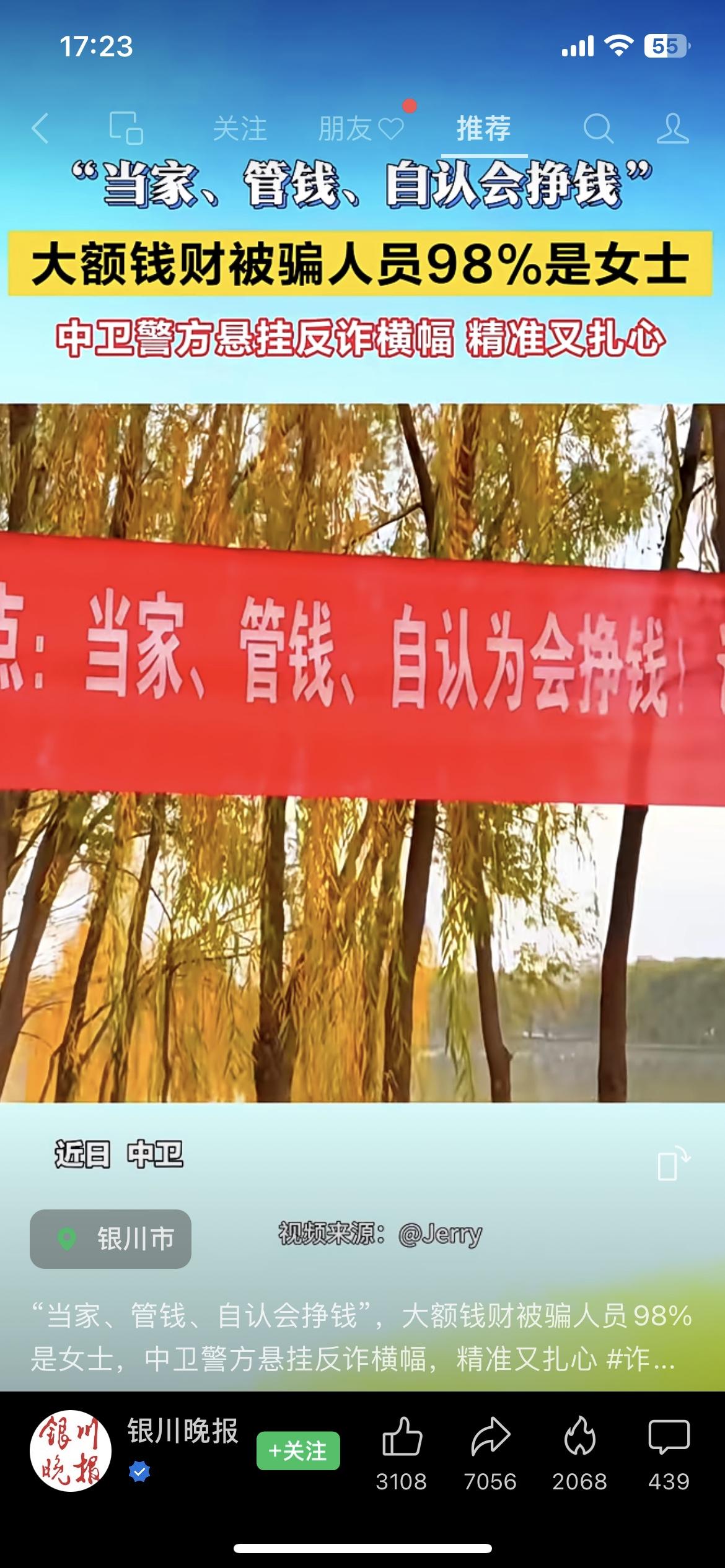 😂中卫警方这反诈横幅,精准到扎心! 当家、管钱、自认为会挣钱”的人里,大额被骗的98%是女士——不是女生不会理财,是骗子专挑“想多赚钱”的心理下套! 身边朋友妈妈就被“高息理财课”骗了十几万,就是信了“躺着赚”才掉坑… 👉不管谁管钱,都要记住“高收益=高风险”!你有啥防骗小技巧?评论区分享! 反诈 防骗指南警醒骗局 防骗局知识
