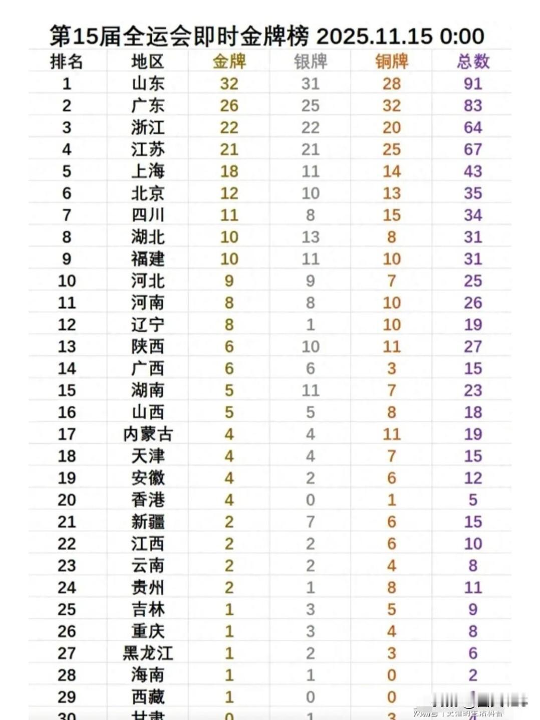 山东队第五个比赛日哑火,没有获得一枚金牌,这也是非常罕见的,夺金势头有所放缓! 全运会第五个比赛日太让人意外了,山东队居然一枚金牌都没拿到。11月14日当天计划产生29枚金牌,山东队此前可是疯狂夺金,这突然哑火确实罕见。 场地自行车馆,河南队女子团体追逐赛赢了山东队,名将鲍珊菊还在女子200米计时赛夺冠,该项目4枚金牌全被河南收入囊中。拳击赛场,河南选手孟雪振也添金。射击比赛里,江苏队李闻怡战胜山东名将魏萌夺冠。 不过,这并不影响山东排名第一,32金领先广东6金。山东项目多点开花,优势仍大,后面比赛还长,期待山东队重振雄风。