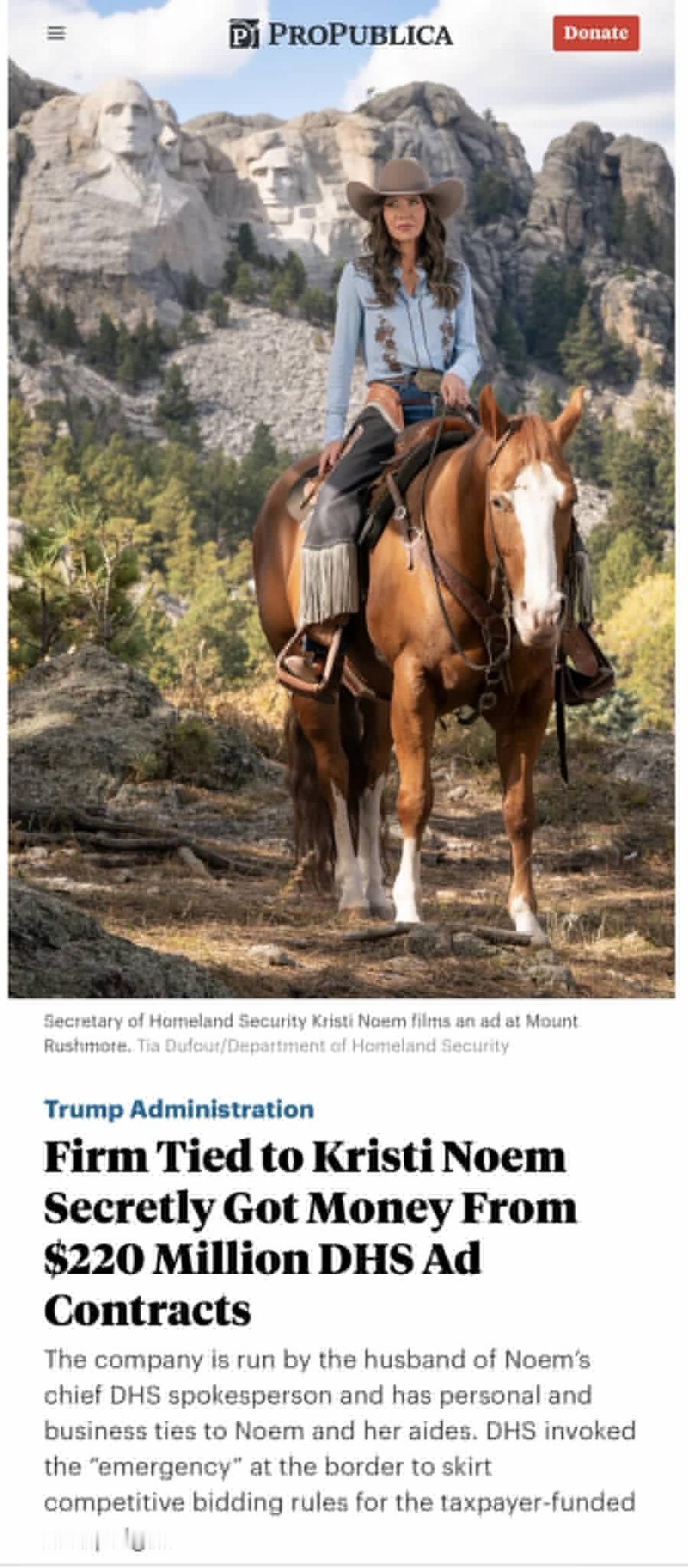 美国国土安全部以“紧急状态”为由取消了竞标,然后,部长诺姆的关联公司获得了国土安全部2.2亿美元的广告合同。