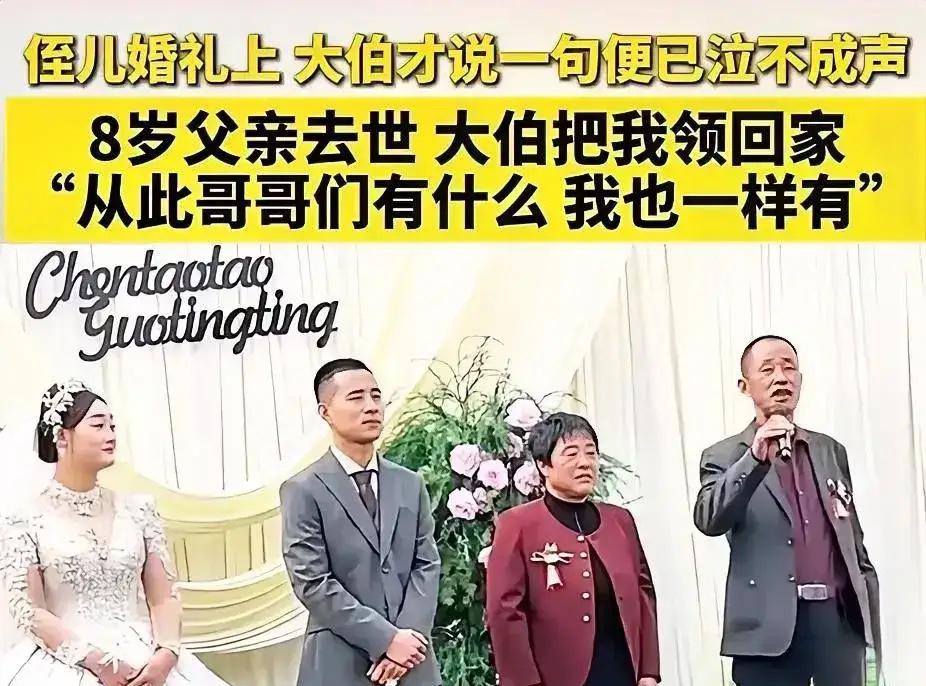 近日,山西一名男子举行婚礼,婚礼由他的大伯主持。 当大伯站在台上,说到“感谢大家在百忙之中来参加我侄儿、侄媳的婚礼”时,声音不禁哽咽了。那是因为八岁那年男子父亲去世,大伯视自己如亲生儿子一样,堂哥有啥他就有啥。 舞台上的灯光打在大伯略显苍老的脸上,他抬手抹了把眼角,试图掩饰情绪,可颤抖的声音还是出卖了他。台下的宾客们瞬间安静下来,不少知道内情的亲友悄悄红了眼眶。谁能想到,这个穿着笔挺中山装、努力维持体面的主持人,背后藏着二十多年的含辛茹苦——当年弟媳在丈夫去世后不久,就因不堪重负离家出走,留下八岁的侄儿李明(化名)孤苦无依,是大伯李建国(化名)拍着胸脯承诺:“以后我养他,绝不让孩子受半点委屈。” 那时大伯家并不富裕,靠着几亩薄田和农闲时打零工维持生计,家里还有一个比李明大两岁的堂哥。可大伯说到做到,给两个孩子买衣服永远是双份,布料、款式一模一样;上学时,堂哥有的文具、课外书,李明桌上绝不会少;就连过年的压岁钱,大伯也总是偷偷给李明多塞五十块,怕他觉得自己和堂哥不一样。有一次,李明和堂哥同时发烧,大伯背着李明跑了三公里山路去卫生院,让妻子在家照顾堂哥,一路上他喘着粗气,却紧紧搂着李明的后背,嘴里念叨:“明儿别怕,大伯在呢。” 李明至今记得,上初中时他因为没有父母被同学嘲笑,哭着跑回家说不想上学。大伯没有打骂他,而是蹲在地上,用粗糙的手掌擦去他的眼泪:“咱不跟他们一般见识,你要好好读书,将来出人头地,让别人看看,咱李明不比任何人差。”为了让李明安心上学,大伯每天天不亮就去地里干活,晚上还要帮人装卸货物,硬是供他读完了高中、考上了大学。大学期间,李明的学费和生活费全靠大伯支撑,每次视频通话,大伯都说“家里一切都好”,可李明后来才知道,那些年大伯为了给他凑学费,戒掉了抽了十几年的烟,连一件新衣服都舍不得买。 毕业后李明留在城里工作,每次回家,大伯总会提前杀好鸡、炖好肉,把他爱吃的菜摆满一桌。得知李明处了对象,大伯比谁都高兴,主动拿出自己攒了一辈子的积蓄,说:“明儿,这钱你拿着,给女方家当彩礼,再买套像样的婚房,大伯不能让你在丈母娘面前抬不起头。”筹备婚礼时,大伯更是忙前忙后,从联系婚庆公司到宴请亲友,每件事都亲力亲为,甚至主动提出要当主持人,他说:“我看着你长大,现在看着你成家,这个主持人,我必须来当。” 舞台上,大伯平复了情绪,继续说道:“今天看到侄儿娶了这么好的媳妇,我心里比谁都激动。二十多年了,我总算能给我弟一个交代,能看着明儿过上幸福的日子。”说到这里,他看向台下的李明和侄媳,眼眶再次湿润:“明儿,以后要好好疼媳妇,好好过日子,不能辜负大家的期望,也不能忘了你爸你妈在天之灵。” 李明再也忍不住,拉着妻子快步走上台,对着大伯深深鞠了一躬,声音哽咽:“大伯,这些年辛苦您了,没有您就没有我的今天。以后我和媳妇会好好孝敬您,就像孝敬亲生父母一样。”侄媳也跟着说道:“大伯,谢谢您把李明培养得这么好,以后我们会常回家看您,照顾您。”台下响起雷鸣般的掌声,不少宾客被这真挚的亲情打动,悄悄擦拭着眼泪。 一旁的堂哥看着这一幕,笑着抹了把脸:“我爸这些年心里一直装着明儿,现在明儿成家了,他也算了却了一桩心愿。我们兄弟俩从小一起长大,早就跟亲兄弟没区别了。”周围的亲友纷纷感慨,大伯用二十多年的坚守,诠释了什么是“长兄如父”,这份跨越血缘的亲情,比山还重,比海还深。 亲情从来不止于血缘,更在于日复一日的陪伴与担当。大伯李建国用自己的行动,给李明撑起了一片天,也给所有人上了生动的一课——善良与责任,能让亲情超越血缘的界限,温暖人心。这样的亲情,值得我们永远铭记与感恩。 各位读者你们怎么看?欢迎在评论区讨论。