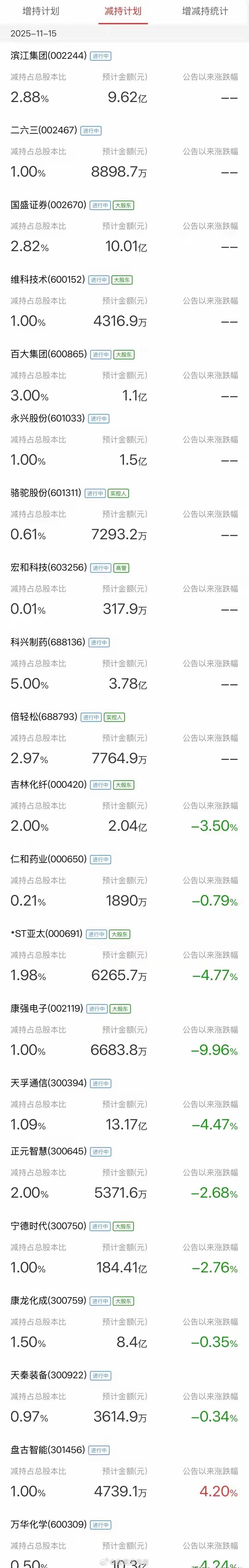 深夜炸雷!5股狂减225亿,1股减持184亿创年内新高,涉及证券、电池、通信龙头昨晚A股迎来减持“狂潮”,17家公司集中发布减持公告,其中5家合计减持金额超225亿,1家单股减持达184亿,3家减持近10亿,涉及证券、新能源电池、通信、医药等多个领域龙头企业,直接刷新年内减持纪录。此前新易盛42亿减持已堪称年内大手笔,随后东方财富64亿减持将其超越,而昨晚这波减持中,184亿的单日减持额再次打破今年纪录。A股5400余家上市公司中,日常减持本属常态,金额多在几百万到几亿之间,超10亿的减持已属罕见,此次多家大市值龙头集中大额减持,引发市场关注。核心减持标的亮点(附关键数据)• 宁德时代:当前股价404元,年内从128元涨至现价,区间涨幅215%。公司股东拟询价转让4563.24万股(占总股本1%),以1.84万亿市值计算,预计减持184.41亿。作为机构重仓股,机构为护基金净值大概率不会同步抛售,大幅下跌概率较低,但减持对股价仍会产生一定影响。• 天孚通信:股价155.47元,今年4月仅39元,9月最高涨至224元,半年内区间涨幅480%。股东拟询价转让850万股(占总股本1.09%),以1208.6亿市值测算,减持金额13.18亿。• 国盛证券:股价18.34元,年内上涨158%,三位股东拟合计减持2.82%股份,公司市值354.89亿,预计减持10.01亿。• 康龙化成:股价31.48元,年内反弹62%(历史最高曾达109元),两位股东拟通过集中竞价+大宗交易减持1.5%股份,对应减持金额8.39亿。• 滨江集团:股价10.37元,年内上涨93%,控股股东拟大宗交易减持2.88%股份,以333.86亿市值计算,减持金额9.62亿。值得注意的是,当前大额减持多采用询价转让方式,股票不会直接流入散户手中,而是通过机构报价转让给基金、ETF等金融产品。此外,昨晚还有科兴制药(拟减持5%)、二六三(1%)、百大集团(3%)、维科技术(1%)等多家公司发布减持公告,宏和科技、永兴股份等也在列。以上减持信息均为客观统计,不构成任何投资建议,股市有风险,投资需谨慎!