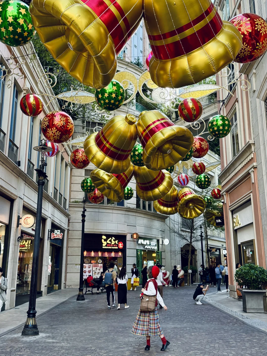 📸P13,巨型圣诞铃铛与彩球横跨整条街~还没完全布置好,圣诞树还没摆