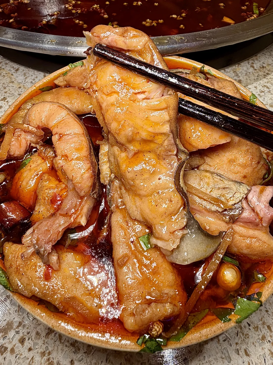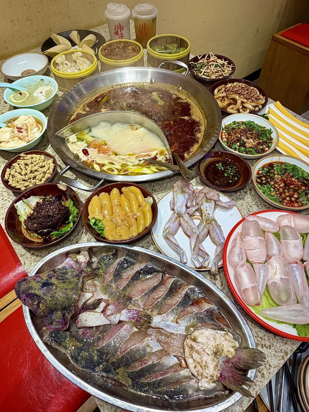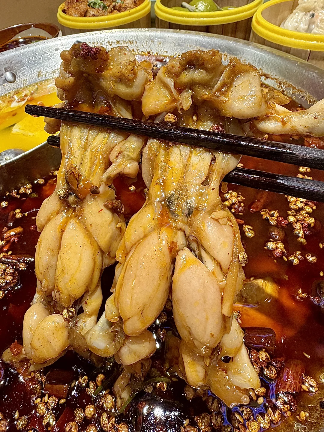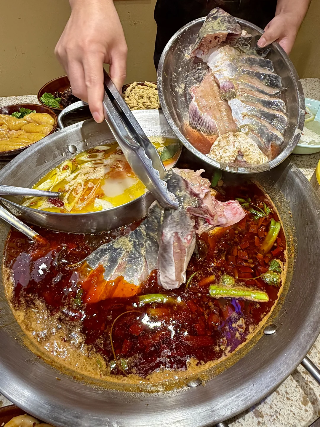 他家是现捞活鱼🐟➕鲜活牛蛙🐸,一定要点他们家椒麻味鱼蛙火锅好好吃🥹特别是沸腾之后椒麻香油浇在江团鱼和牛蛙锅上简直被香晕了!!配菜推荐鱼籽、鱼泡、空心粉…搭配椒麻锅真的绝!!
