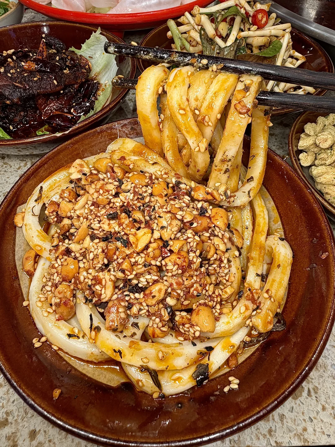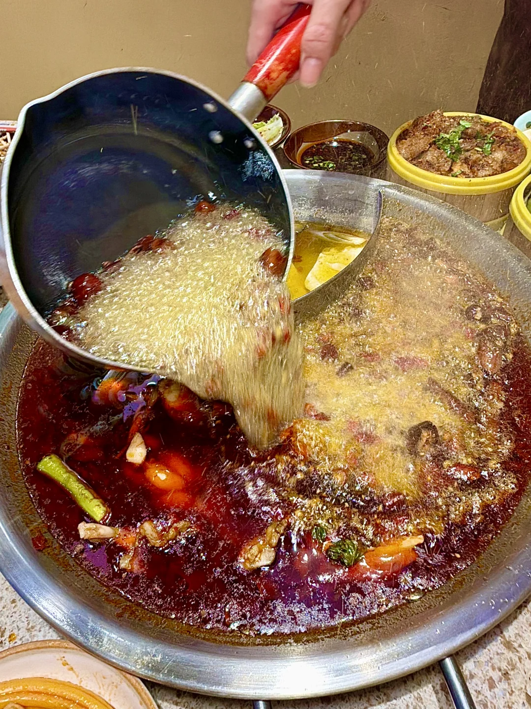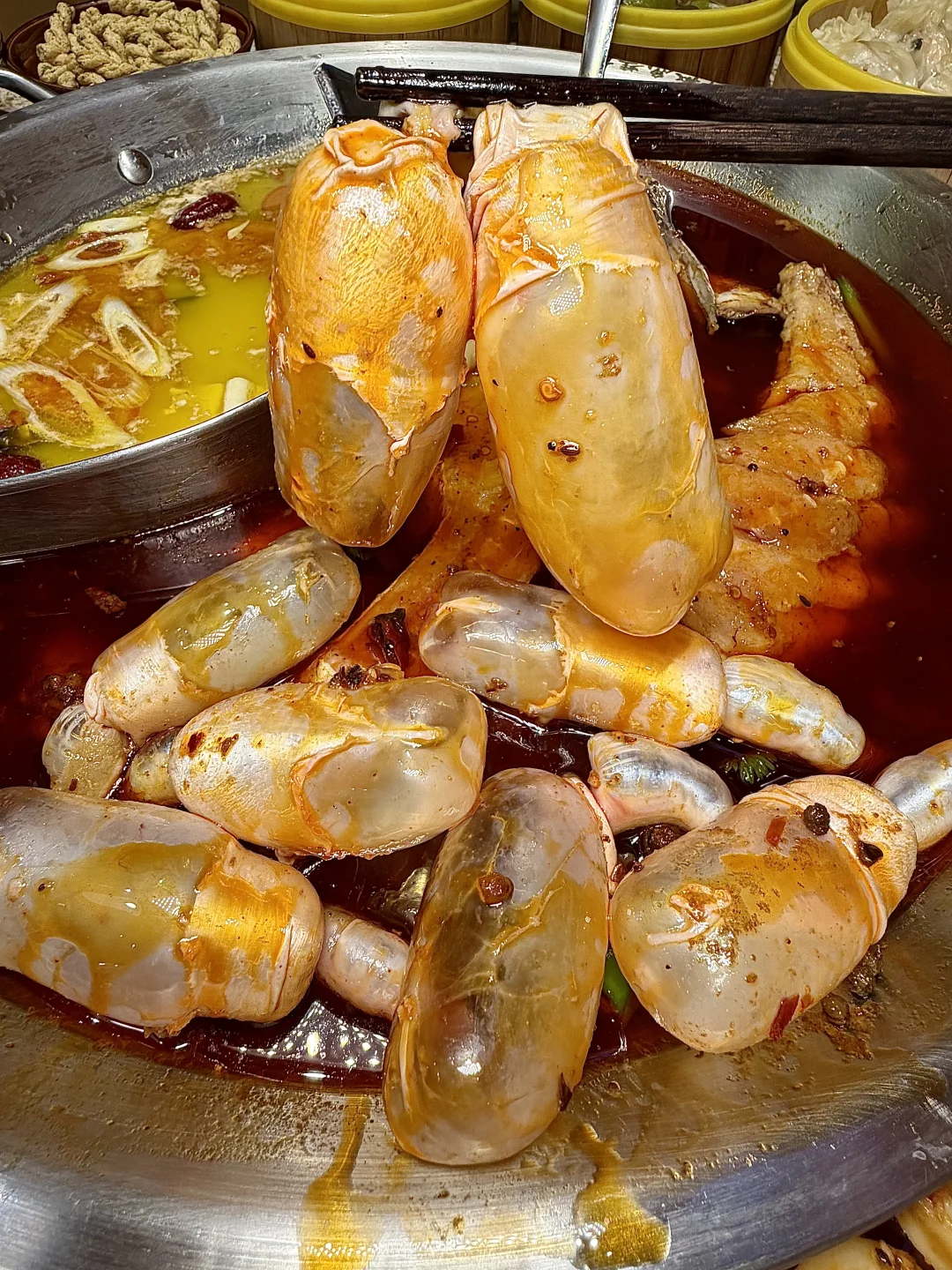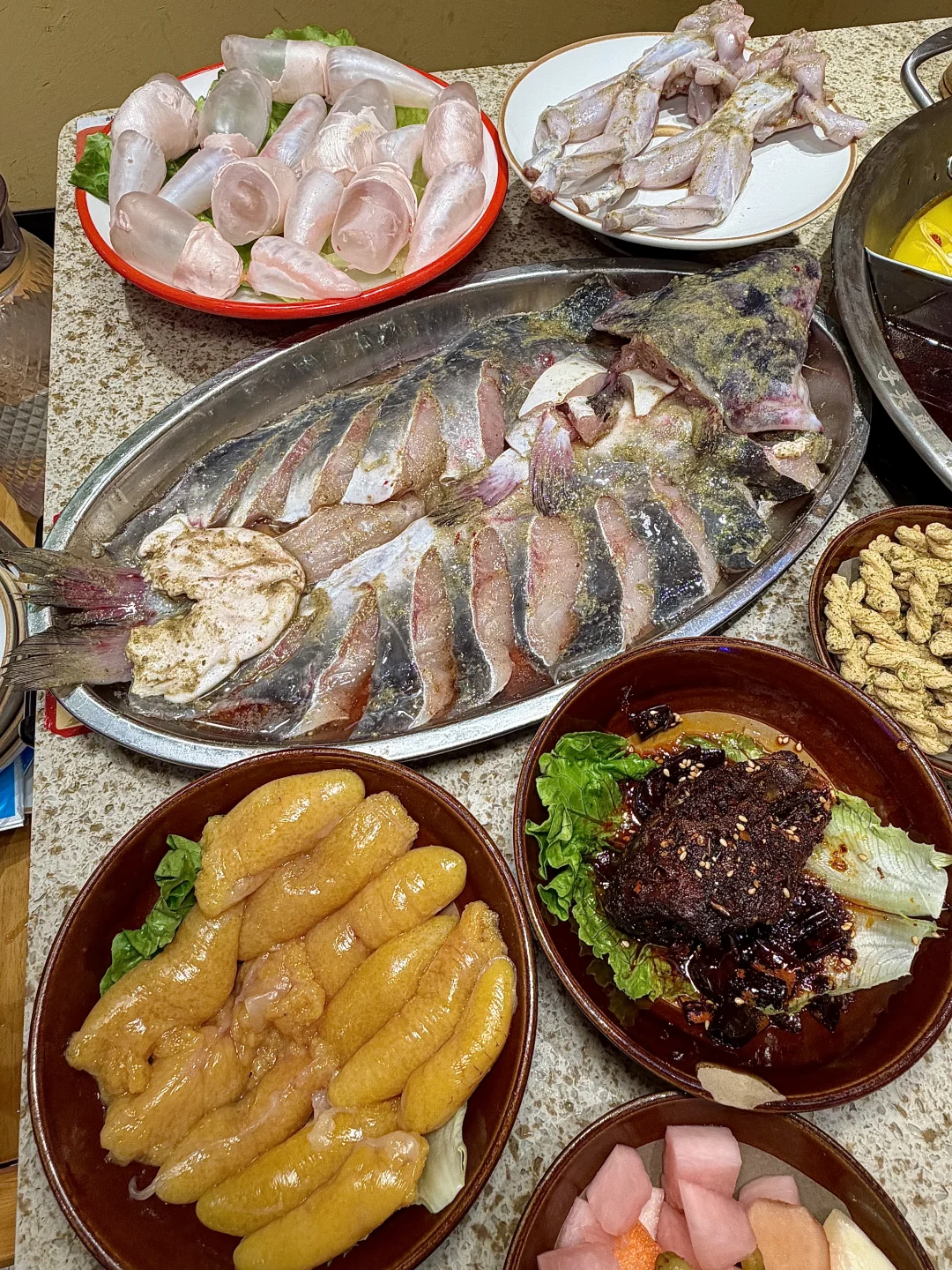 他家是现捞活鱼🐟➕鲜活牛蛙🐸,一定要点他们家椒麻味鱼蛙火锅好好吃🥹特别是沸腾之后椒麻香油浇在江团鱼和牛蛙锅上简直被香晕了!!配菜推荐鱼籽、鱼泡、空心粉…搭配椒麻锅真的绝!!