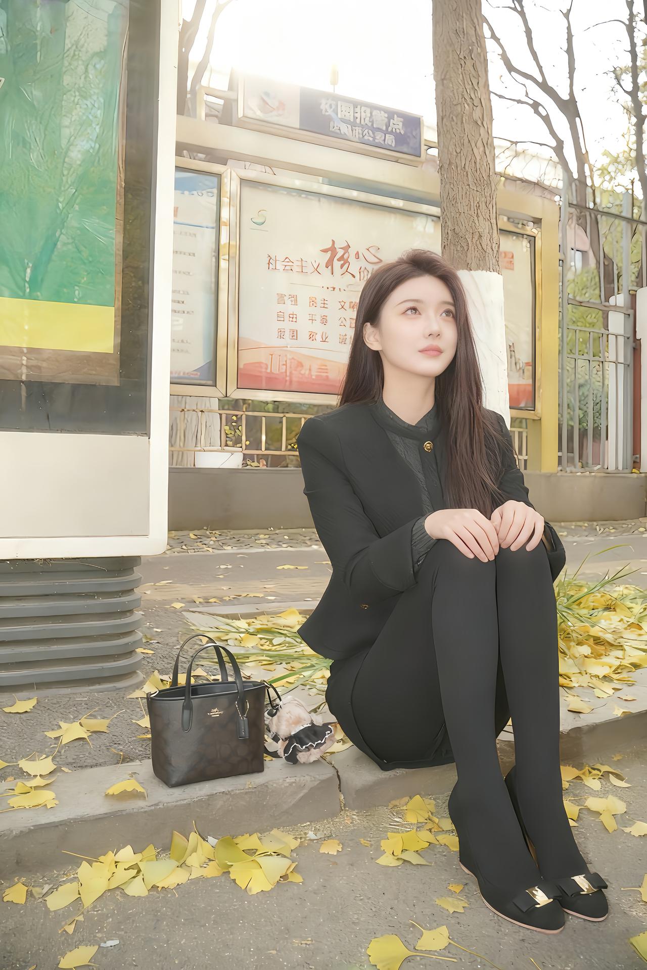 宝子们,秋天的银杏叶也太好拍了吧~今天穿了一身黑,小金扣外套精致又显气质,搭配紧身裤和蝴蝶结高跟鞋,既干练又藏不住温柔感~旁边的老花包包和小玩偶挂件,给整体造型加了点俏皮感~坐在铺满银杏叶的路边,阳光透过树叶洒下来,氛围感直接拉满!这种秋日限定的浪漫,真的让人忍不住按下快门~