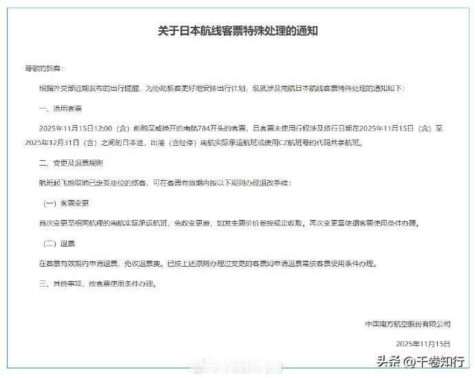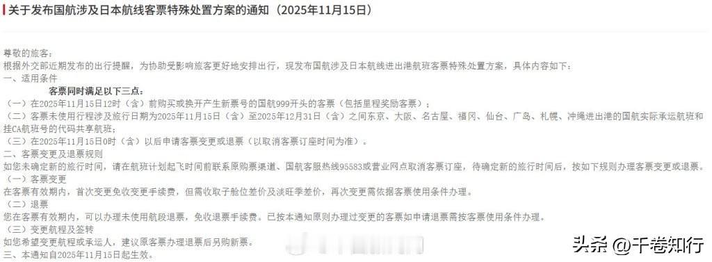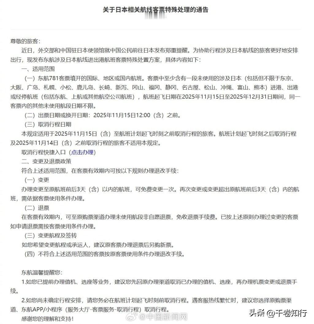使馆发声后航司齐动,日本航线突然进入“退改期” 三大航司同时官宣“日本机票免费退改”的瞬间,真正紧张的不是旅客,而是东京。 11 月 15 日,中国驻日本使馆发出提醒,建议近期避免前往日本。不到一天,国航、东航、南航齐刷刷发布客票处理方案:日本航线免费退改。 这不是程序性动作,而是一次清晰、同步、带着信号的应对机制。 为什么动作这么快? 因为涉及中国公民安全的议题,从来不是“提醒一下”那么简单。 使馆发声,航司接力,这是一套成熟的响应链: ——提醒是预判风险; ——退改是降低成本; ——同步则是告诉外界:这不是孤立事件,而是整体判断。 一个国家最硬的底气,不是在外交辞令里,而是在让公民“想回就能回、想退就能退”的体系里。 日本这几年在核污水排放、社会治安、涉华舆论等问题上风波不断。 从偶发事件到结构性风险,趋势其实很明确: 中国对日本的安全评估正在变得更谨慎、更具体,也更务实。 而航司的动作,更像是给市场一个“缓冲区”。 不让旅客承担不确定性,也不让风险在民间滚大。 这就是“做事的人比喊话的人更有说服力”的体现。 从国际关系的角度看,这是一种极具中国特色的稳态处理方式: 不情绪化,不扩大化,但把“保护公民”放在优先级的最顶端。 真正的成熟,是不需要喊口号。 接下来,最值得关注的不是机票,而是日本方面会不会识别到这次信号的分量。 风险从来不是凭空出现的,但对风险的反应,能看出一个国家的底色。