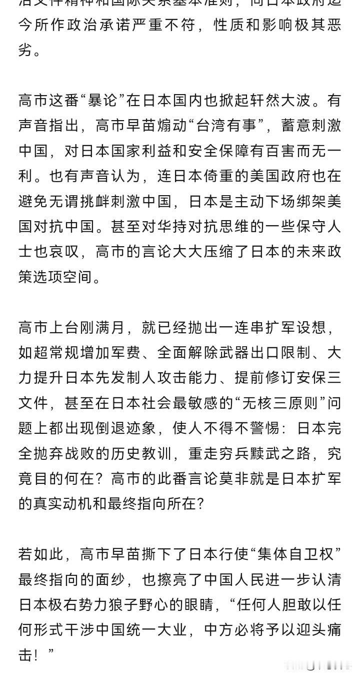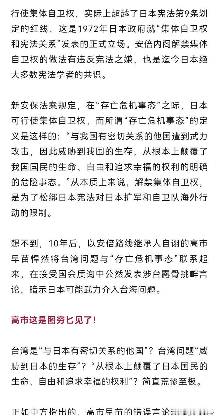 高市“搞事”,而且已经是图穷匕见,我们再不能用之前息事宁人的想法来解决问题了! 息事宁人,这是因为我们习惯于把对方当成君子、讲道理的人来对待,但是, “倭人知小礼而无大义,拘小节而无大德,重末节而轻廉耻,畏威而不怀德,强必盗寇,弱必卑伏” 比如,以钓鱼岛的事情来看,中日建交,邓公曾提出“搁置争议,共同开发”的方针,可是,日方却趁机步步紧逼,先在岛上建直升机场,再建灯塔,2012年9月10日,日本政府对钓鱼岛实施“国有化”,严重侵犯中国的领土主权。 可以说,日本的做法,就是步步为营,实力所限,不能鲸吞,则慢慢蚕食。从甲午战争到侵华战争,这几十年间,日本除了挑起大规模战争,在间歇期也是在不停地以调整驻军驻地、挑起纷争、外交事端等方式,今天占领一个村庄,明天占领一个城镇的方式,不断地蚕食侵占我国领土。 此次,2025年10月7日,以安倍路线继承人自诩的高市在日本国会大放厥词,悍然将台湾问题与“存亡危机事态”联系起来,事情的根由又可以由2015年7月,安倍晋三在任期间,通过了旨在解禁集体自卫权的新安保法案说起。 10年前,安倍晋三解禁集体自卫权,给日本宪法对日本扩军和自卫队海外行动的限制进行松绑;今天,他的衣钵继承人就以台湾问题与“存亡危机事态”联系起来,假如我们中国大陆要统一台湾,则影响日本生存了,日本可能要武力介入台海问题才行。 多好的承接配合! 可以说,高市这番言行,已经撕下了日本行使“集体自卫权”最终指向的面纱,图穷匕见! 这次,我们也进一步认清了日本极右势力狼子野心,不能再息事宁人,“任何人胆敢以任何形式干涉中国统一大业,中方必将予以迎头痛击!”