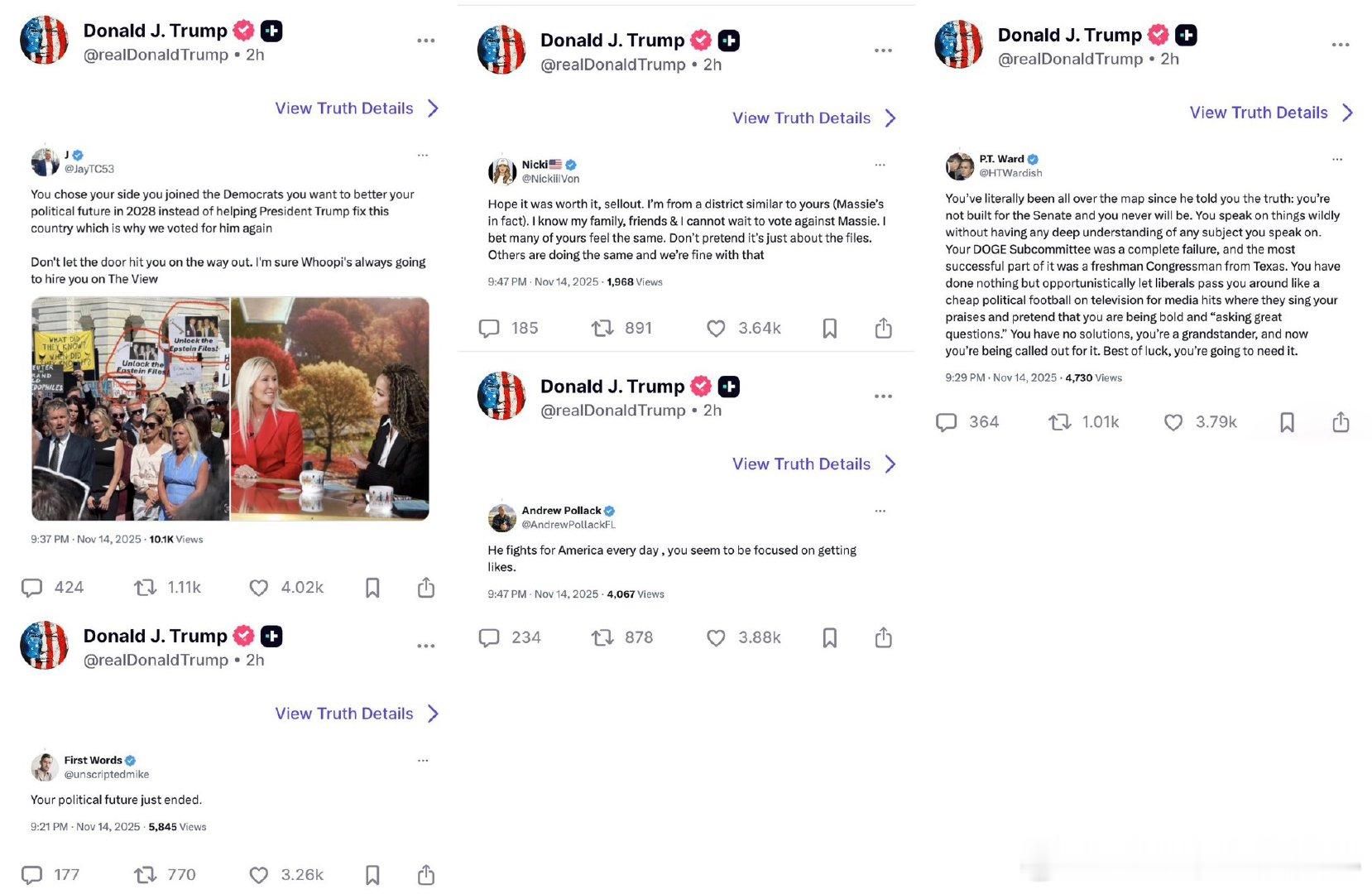 特朗普突然撤回对众议员玛乔丽·泰勒·格林的背书,并在社交平台上以“疯子”“古怪”等激烈词语连发批评,使这场公开决裂迅速发酵。作为特朗普阵营最早、最坚定的盟友之一,以“铁杆支持者”著称多年的格林如今被特朗普点名否定,显示两人之间的矛盾已发展到不可调和的程度。导火索来自多重因素:格林在特朗普议程上的偏离、她推动公开爱泼斯坦案档案的强硬姿态、以及在部分政策上对特朗普的公开质疑。这些举动被特朗普阵营视为“背离路线”,而格林则反击称,特朗普之所以动怒,是因为她坚持揭露敏感文件,不愿被政治利益牵制。这一裂痕的意义超出个人恩怨。对格林而言,失去特朗普背书意味着她在党内和选区的政治地位将受到实质冲击;对共和党而言,这是核心支持群体内部一次罕见的公开分裂,也可能成为未来初选与党内路线之争的前奏。对特朗普阵营而言,“忠诚不绝对就是绝对不忠诚”,代价可能是共和党内整合能力进一步削弱。Donald J. Trump · 2 小时前(转发评论)JayTC53:你已经选择了立场——你加入了民主党。你更在意 2028 年的政治前途,而不是帮助总统特朗普修复这个国家,这才是我们再次投票支持他的原因。别让门在你出去的时候撞到你。我敢肯定《观点》节目里的乌比·戈德堡随时会雇你的。Donald J. Trump · 2 小时前(转发评论)aicrdmo:希望你觉得这一切值得,叛徒。我来自与你类似的选区(其实就是马西的那个)。我知道我的家人和朋友们都迫不及待想投票反对马西。我敢打赌你的不少选民也有同样想法。别假装这只是因为“文件”的事。别人也在做同样的事,我们对此完全没意见。(2025 年 11 月 14 日晚 9:47 · 1,968 次浏览)Donald J. Trump · 2 小时前(转发评论)PT. Ward(HTWardish):自从他把真相告诉你之后,你的立场就一直飘来飘去:你不适合参议院,以后永远都不会适合。你谈论各种议题,却对自己说的每个话题都缺乏深入理解。你主持的 DOGE 小组委员会完全失败了,它唯一成功的部分还是因为来自德州的一名新科众议员。这些年来你什么都没做,只是机会主义地让自由派在电视上把你当廉价政治足球一样来回踢,只为了蹭媒体曝光,让他们当着镜头夸你、假装你“大胆”“问题问得好”。你没有解决方案,你只会作秀,现在你被揭穿了。祝你好运,你会需要它的。(2025 年 11 月 14 日晚 9:29 · 4,730 次浏览)Donald J. Trump · 2 小时前(转发评论)Andrew Pollack(AndrewPollackFL):他每天都在为美国而战,而你似乎只关心刷点赞。(2025 年 11 月 14 日晚 9:47 · 4,067 次浏览)Donald J. Trump· 2 小时前(转发评论)unscriptedmi:你的政治前途刚刚结束了。(2025 年 11 月 14 日晚 9:21 · 5,845 次浏览)
