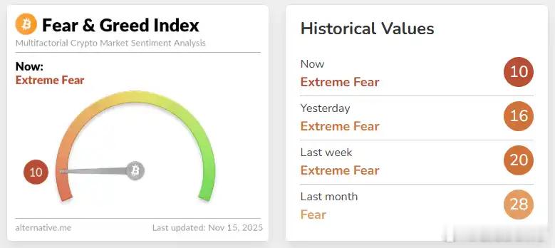 11 月 15 日,Alternative 数据显示,加密市场恐慌与贪婪指数降至 10(昨日为 16),创下本轮牛市以来最低值,市场情绪已连续一周维持在「极度恐慌」区间。该指数综合考虑了波动性、交易量、社交热度、市场调查、比特币占比及谷歌搜索热词等因素。其中波动性和交易量权重最高,各占 25%。指数的持续低位反映出投资者情绪极度谨慎甚至恐慌,短期市场波动可能仍然较大。对于关注行情的投资者来说,这一指标提供了观察市场情绪的重要参考。