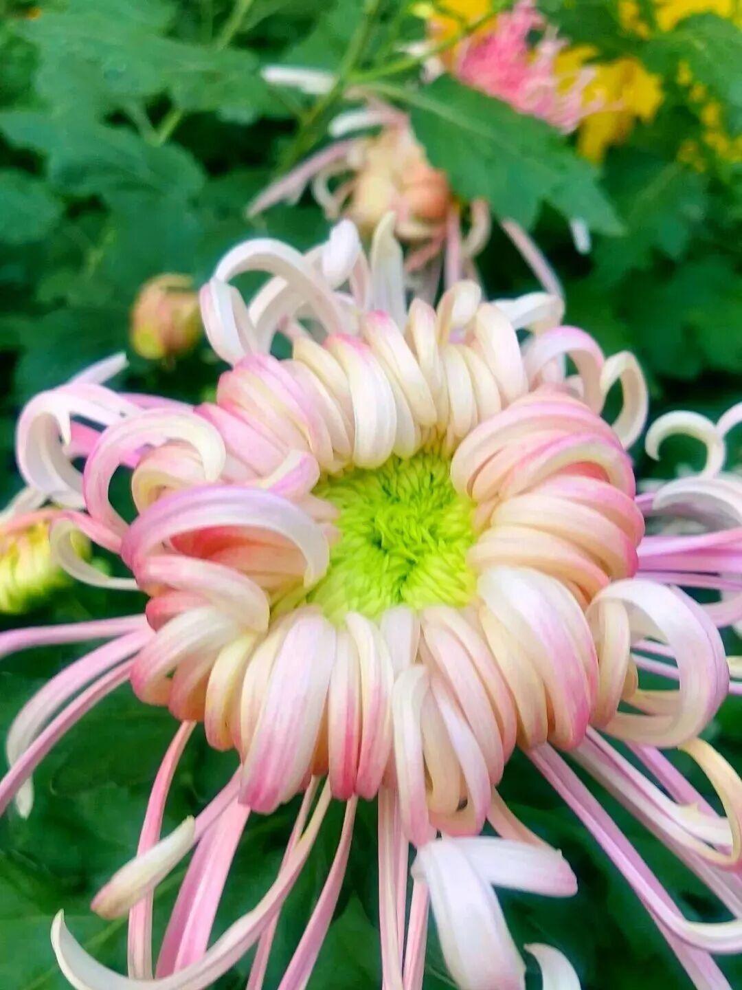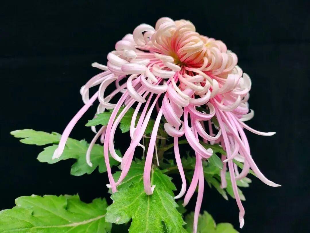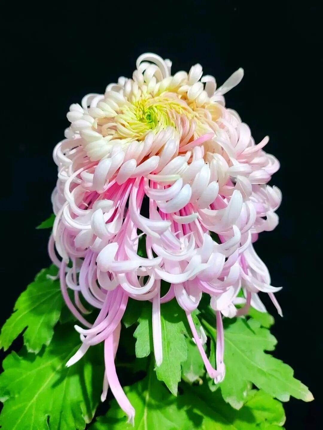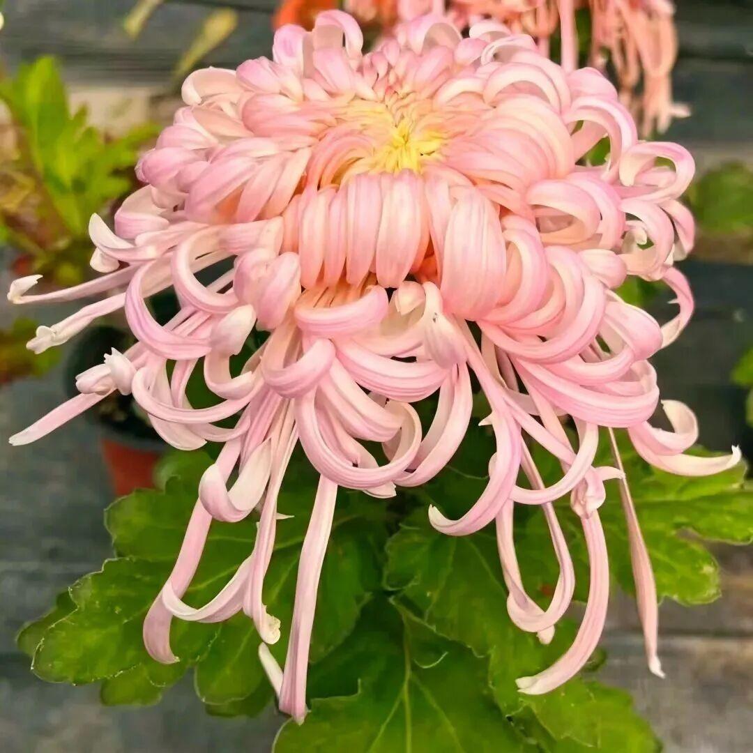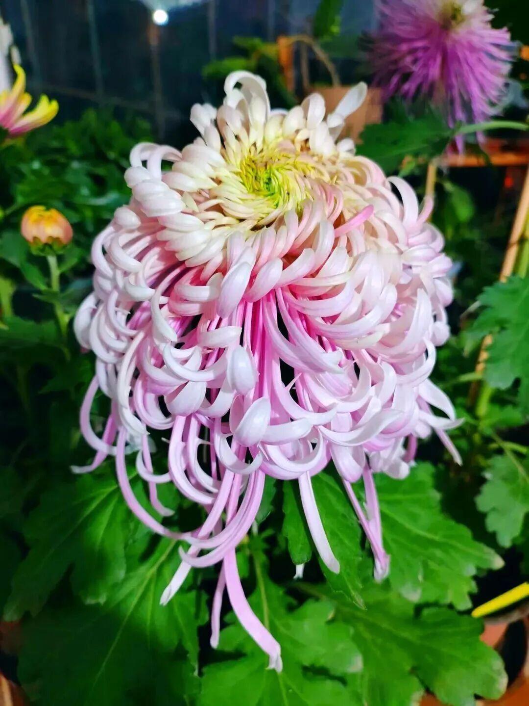 盘龙嫦娥菊花是一种极具观赏价值的大花型菊花品种,其花朵直径可达40厘米,花瓣层叠如裙摆,形似神话中嫦娥的飘逸姿态。花色常见红、粉等亮色调,在阳光下呈现粉紫色,花型优美且花期较长,通常从10月持续开放至次年1月。 花瓣卷曲如盘龙,花色以粉紫色为主,弱光环境下花色较浅,强光下色彩更艳丽。 长势强健,植株矮壮(株高约30厘米),适合培育独头菊或案头菊,叶片肥大油绿,枝干粗壮。 适应性较强,需充足光照和适量水分,控制植株高度可保持花型飘逸。