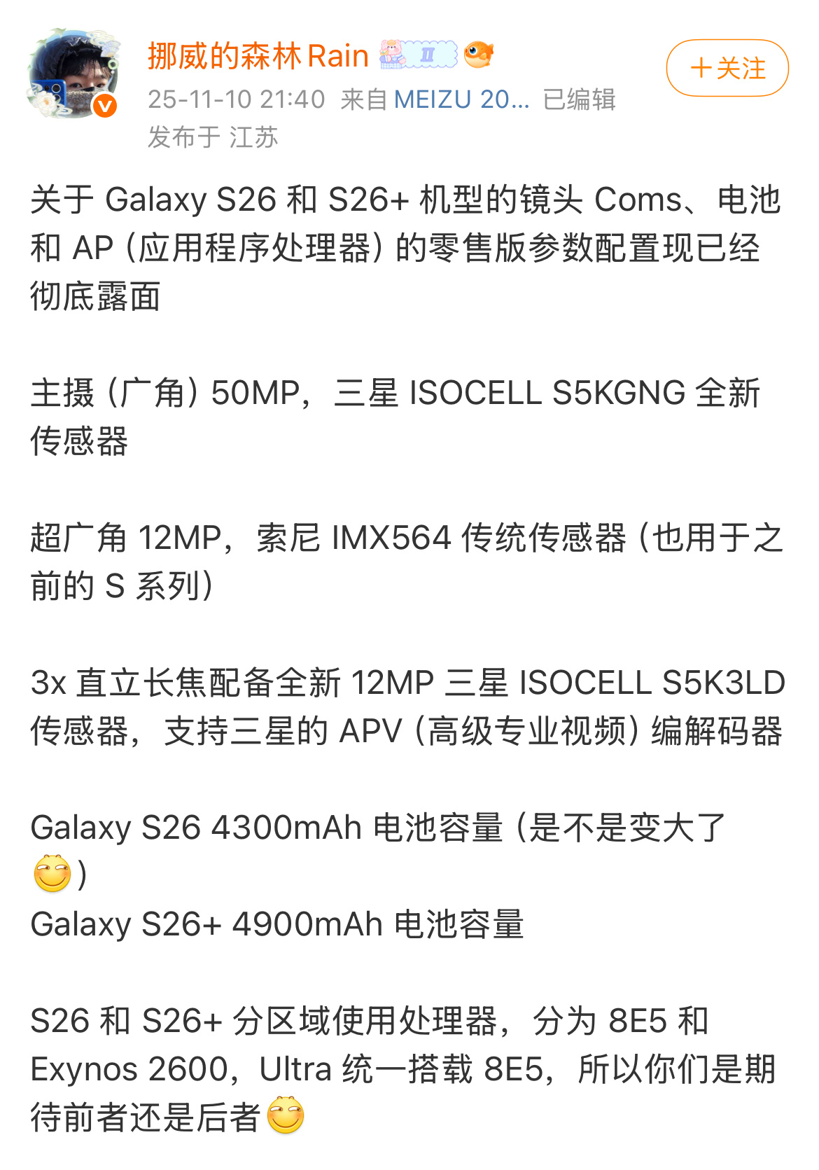 三星S26系列要回归三杯了,S26中杯,S26+大杯,S26 Ultra超大杯,S26/S26+部分地区采用2nm猎户座2600和骁龙8E 5芯片,S26 Ultra都搭载骁龙8E 5芯片,2亿像素主摄,充电和续航方面都有提升,预计明年2月份发布!