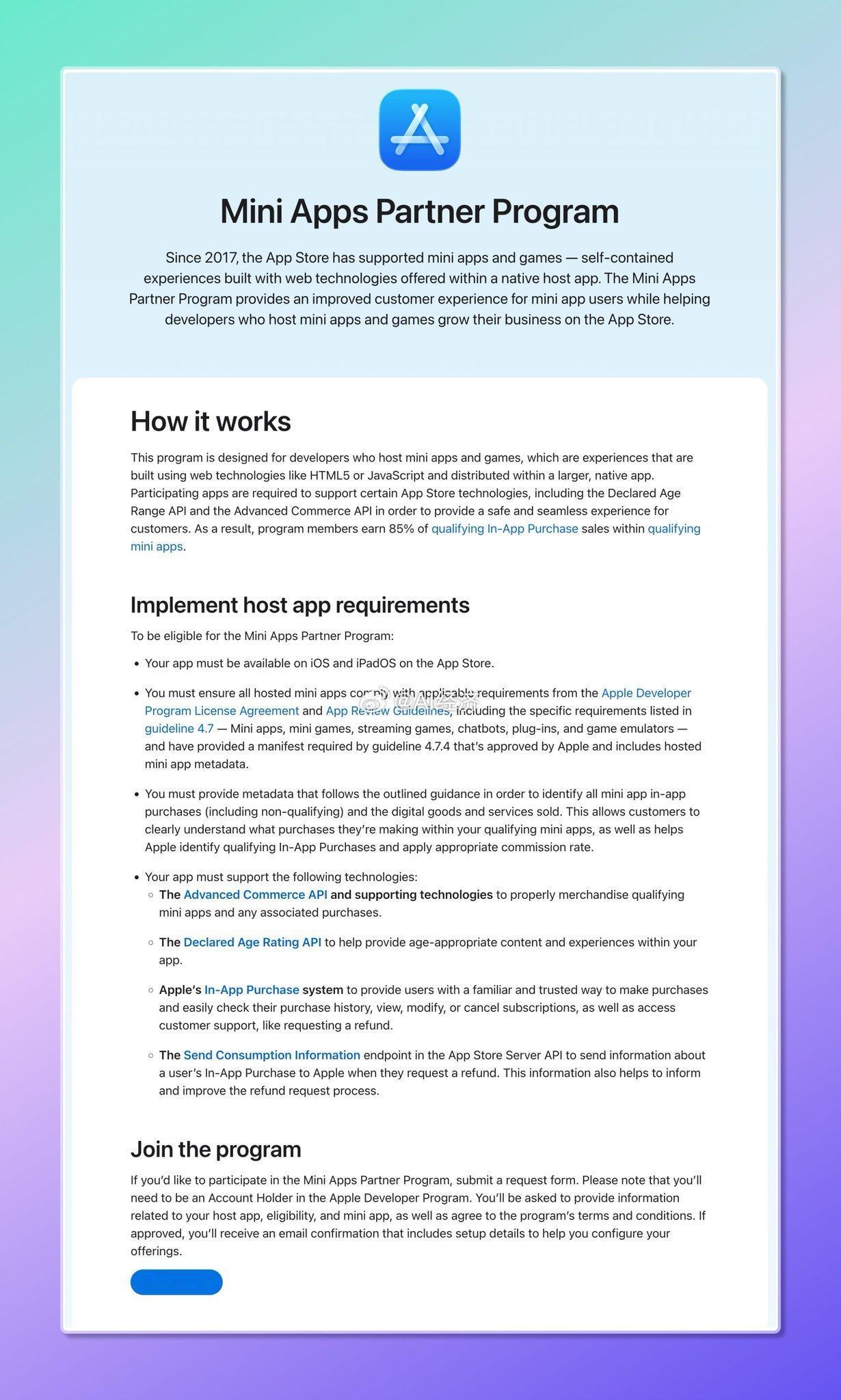 苹果刚刚悄悄宣布了一件看似不起眼,但意义重大的事情:“Mini Apps Partner Program”也就是:“苹果版小程序开发者计划”为了大力推广“苹果版小程序”,苹果将开发者分成比例下降到了15%...这意味着,苹果意识到,随着AI的发展,应用小型化、便捷化、非常易于开发的特点日渐突出。必须做出改变随着AI编程的快速发展,开发一个独立应用变得易如反掌,甚至很快可能发展到人人都能开发应用的阶段。这将带来一个颠覆性的改变,应用商店的重要性可能飞速下降,未来可能AI就能直接调用各种小应用,不再需要应用商店。从这两年AI带动网站和SaaS应用大爆发就能看出来,传统的web网站并没有衰落,随着AI的发展反而焕发第二春,但是传统的web网站,毕竟在手机上体验不友好,移动化的小应用、小程序可能会愈发的重要,未来AI可以轻松调用各种小程序来帮助用户完成日常的各种任务。就像现在的微信小程序一样,大家直接就能在里面完成各种的扫码下单、订购票务、排队等餐、办理各种便民服务。而未来则是:一句话,AI来自动调用各种小程序来完成这一切。更加的便利!