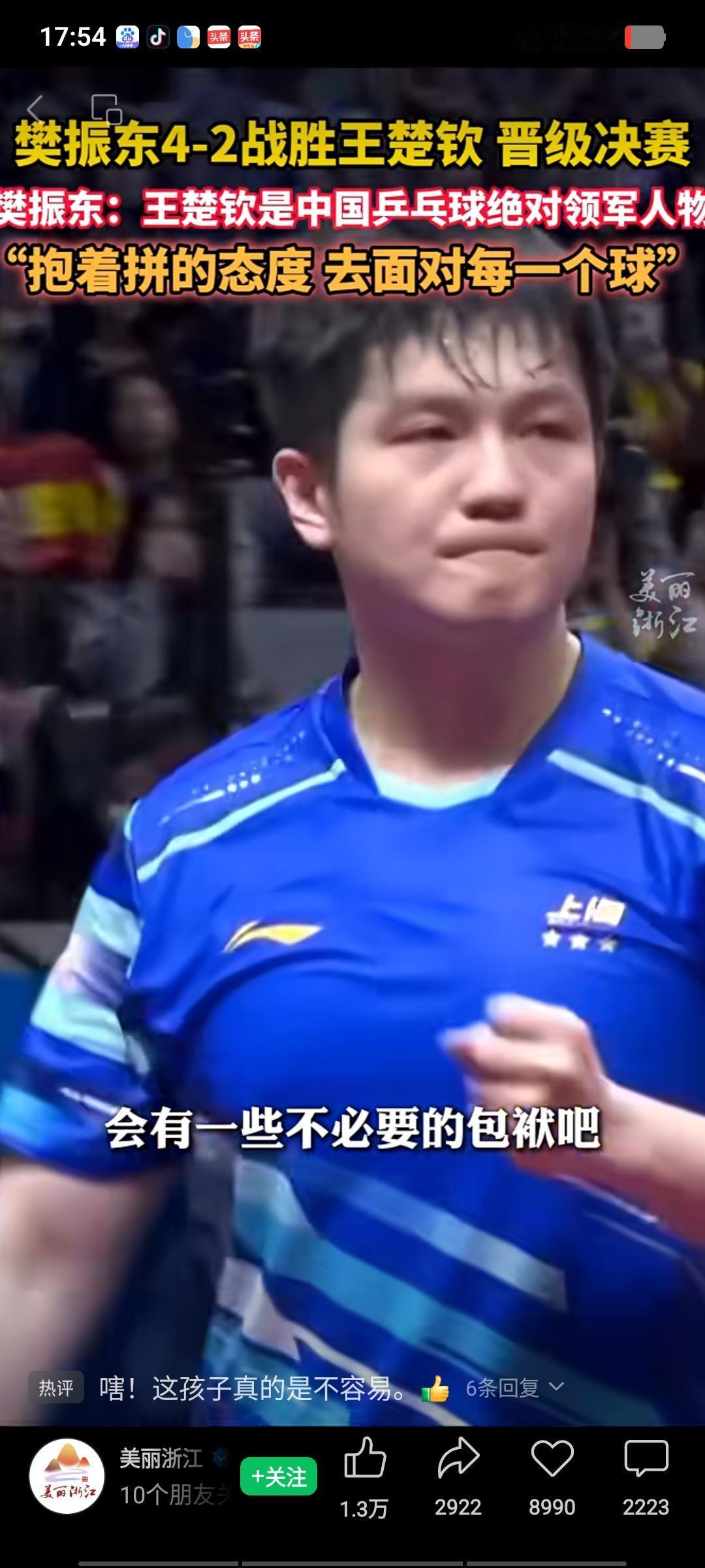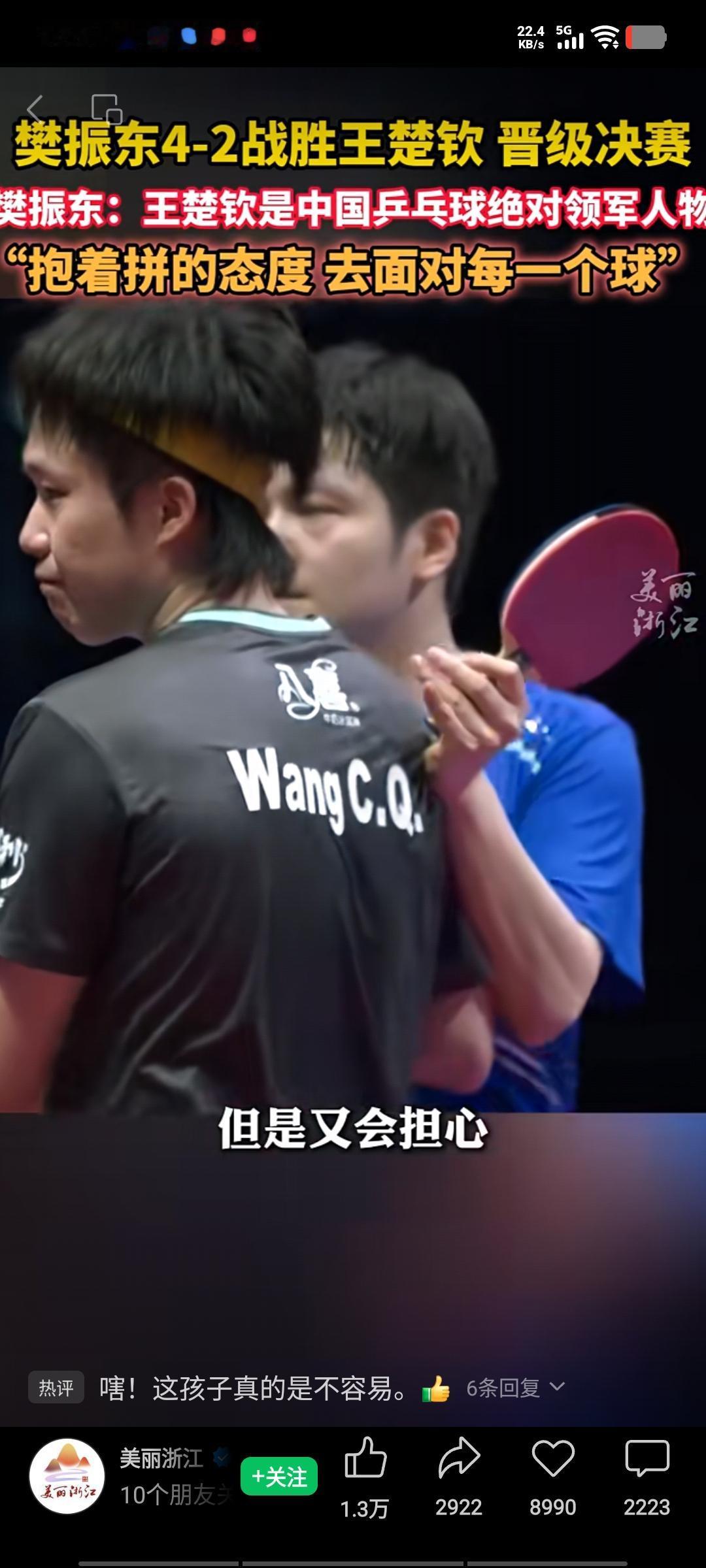 樊振东在德国多特蒙德乒乓球队的教练齐文承,接受采访时表示:“我期望他能夺冠,毕竟我们过去都在八一队,我特别希望他能拿下冠军。”齐指导十分欣赏樊振东,想来小胖能到德甲打球,也是他从中运作促成的。 今日樊振东与王楚钦的比赛精彩纷呈,樊振东两度落后又两度扳平,最终以4比2击败王楚钦,着实难能可贵。他扛住了全场为王楚钦加油的呐喊声,不仅战胜了对手,更战胜了自我,其心态愈发成熟。 期待樊振东在与林诗栋的决赛中发挥得更加出色,最终斩获全运会乒乓球男单冠军。
