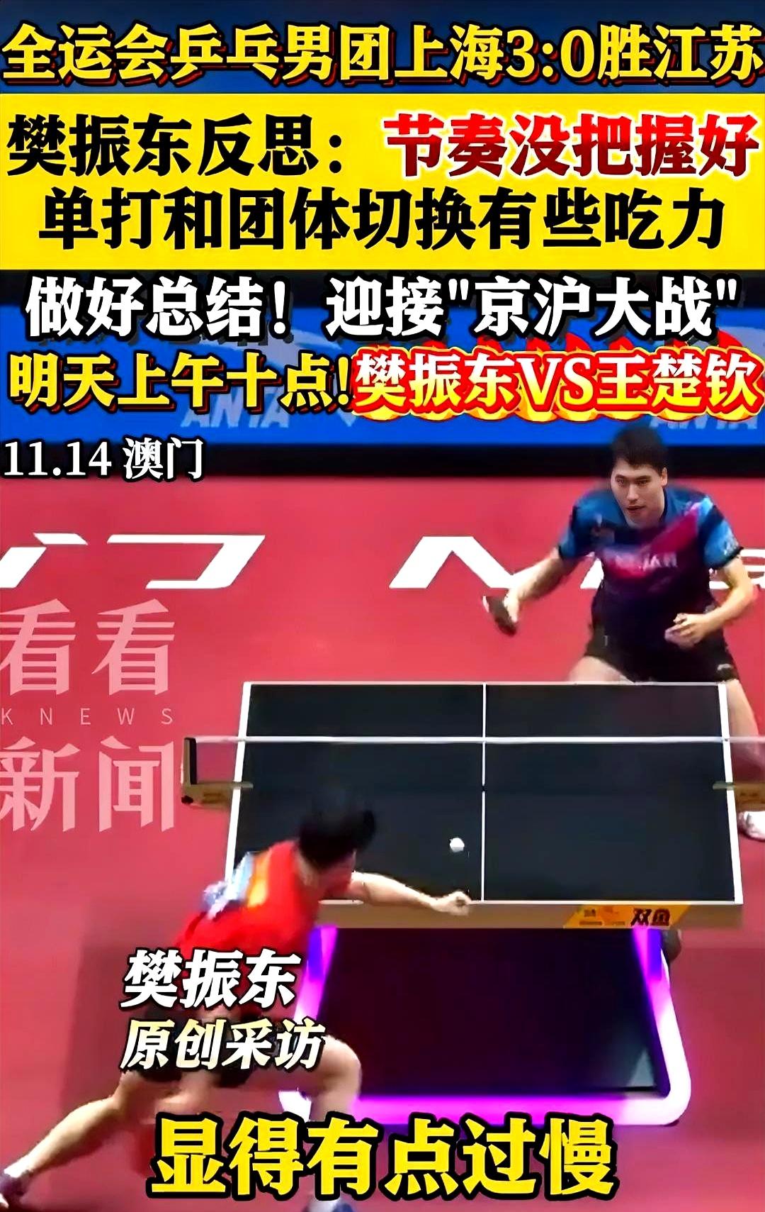 樊振东全运会男团带上海队3:0横扫江苏队,实力真能打!但赛后采访直接自曝要“反思”——不是谦虚,是细节控藏不住! 这次他试了反手拧拉+正手快带的新战术,效果亮眼却自己挑刺:“某些回合衔接不够流畅”。教练都夸他训练主动加练节奏切换,像闯关似的死磕团体赛和单打差异。 都拿全满贯了还这么卷?巅峰期不躺平反而抠技术细节,这种对卓越的执着才是竞技体育最该有的样子!藏不住的冠军心态,难怪能一直稳坐顶尖——这哪是反思,明明是长红的密码啊!