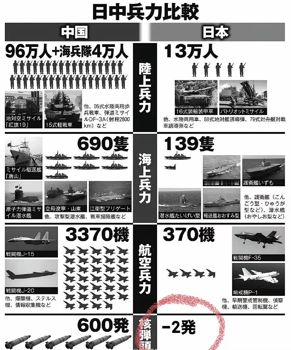 日网友精辟地看中日军力对比,其中最精辟的是核武器-2发。 看来小日本的网友玩梗的能力不弱啊!其实还应该再加上一个,东京热!到时候一旦真正开战,会让东京变成真正的东京热! 难怪石破茂觉得现在的日本和二战时一样,明知会战败,还要打一场。 这是因为他们付出的代价太低太低了!二战后迅速崛起成强国,目前他们正面临内外交困局面,有可能真正铤而走险!反正他们觉得哪怕失败了,也不需要付出什么。 所以如果有战,一定要东京热浪滚滚,把日本炙烤了,把他们打怕了!