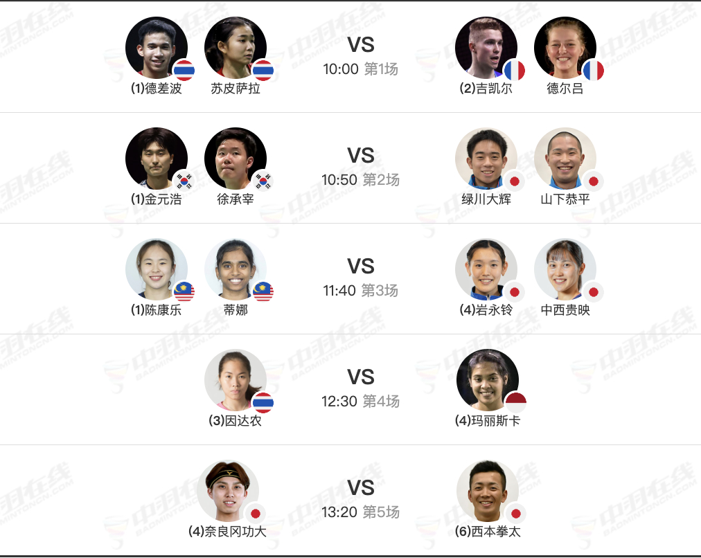 11月16日各单项决赛,早上10点开赛:1、德差波/苏皮萨拉🇹🇭 vs 🇫🇷吉凯尔/德尔吕(2-1)2、金元昊/徐承宰🇰🇷 vs 🇯🇵绿川大辉/山下恭平(2-0)3、陈康乐/蒂娜🇲🇾 vs 🇯🇵岩永铃/中西贵映(6-2)4、因达农🇹🇭 vs 🇮🇩玛丽斯卡(10-3)5、奈良冈功大🇯🇵 vs 🇯🇵西本拳太(1-0)
